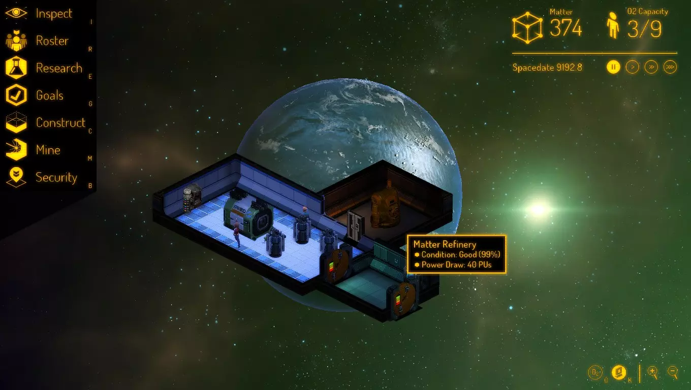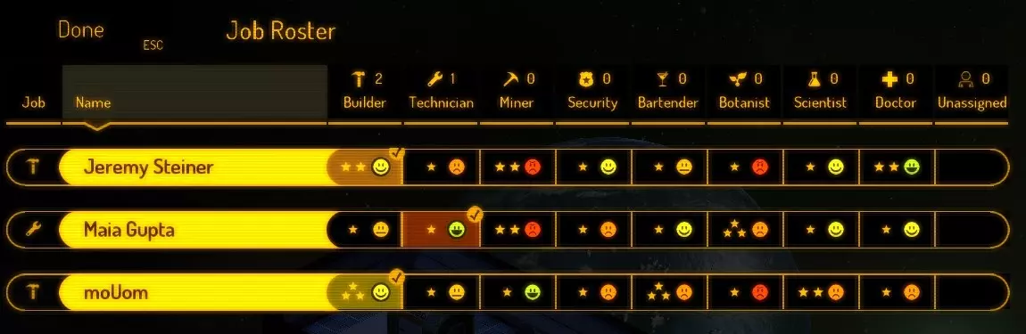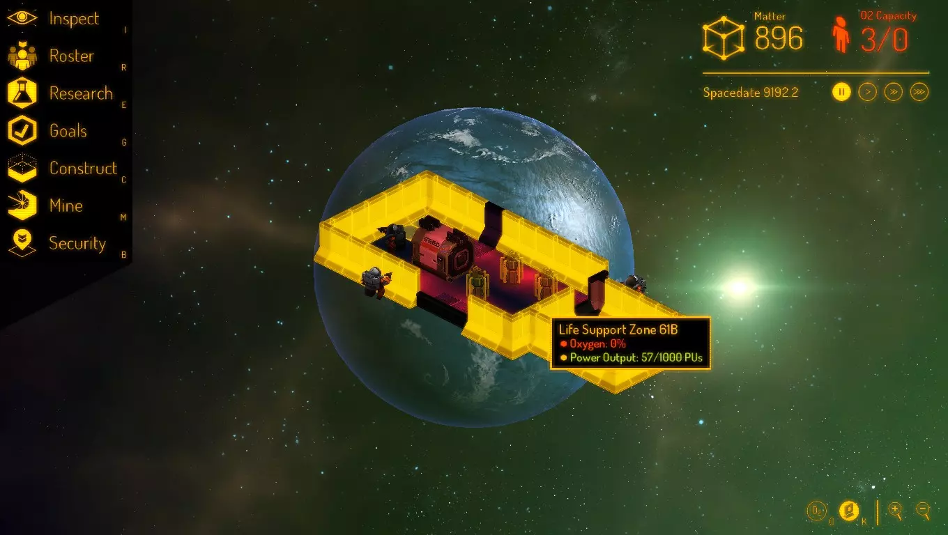 还有最后一点,每次加载时地图选择都是随机的。这意味着如果你的太空邻居发现了一个绝佳位置,除非他/她将该地图的初始存档发送给你,否则对你来说那些坐标很可能是不同的。 第一章:窒息——沉默的杀手 欢迎回来,太空基地居民! 看来你要么是忽略了教程,要么是没弄明白气流和电力系统背后的原理。别担心,我这位喘不过气的伙伴,我们会在这里为你提供前进的指引。在本章中,我们将涵盖刚开始游戏时需要了解的简单基础知识以及该做的事情。 我们将探讨以下内容: 工作、初始种子、氧气循环器、房间、电力 你选择了一个合适的位置并直接进入了游戏。现在你应该已经抵达,并且处于待命模式(已暂停)。现在是检查人员名单并决定是否需要重置的最佳时机。有时进入新地图后,开局可能不尽如人意,就像三个活宝一样。如果出现这种情况,只需重新开始建造基地。一旦你拥有了一支优秀的三人 crew 队伍,就该观察周围区域,并规划如何应对这个区域了。一如既往,确保所有人都处于待命模式,以免消耗他们有限的氧气供应。在你勘察完区域并确定小行星采集地点后,就该建造你的前三个房间了。 1. 让所有三名 crew 都成为建造者。
