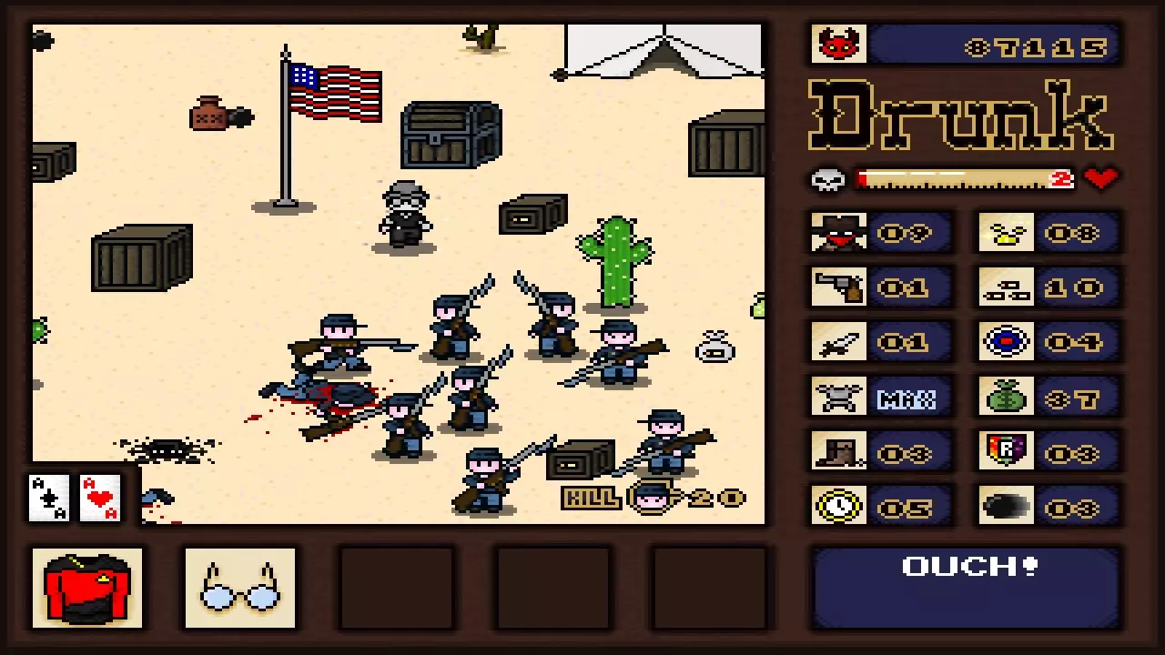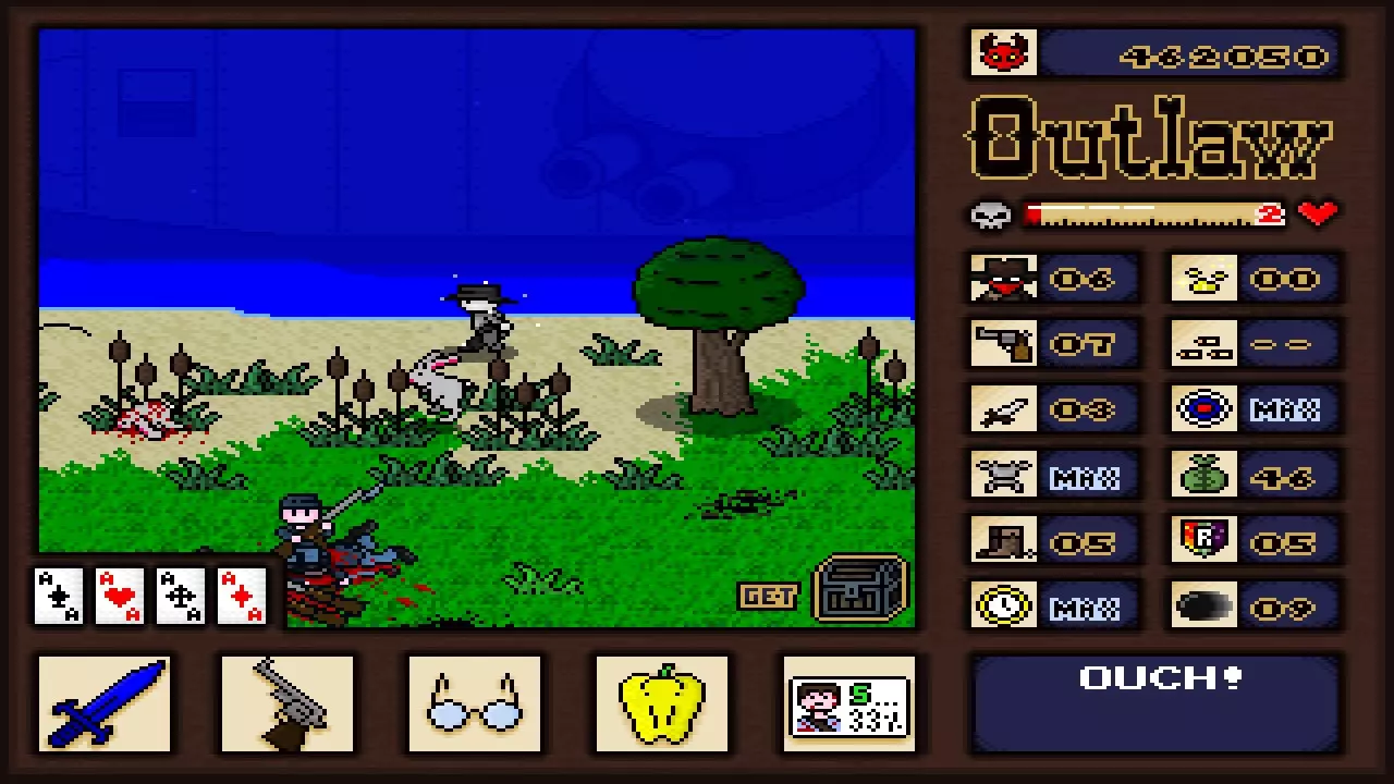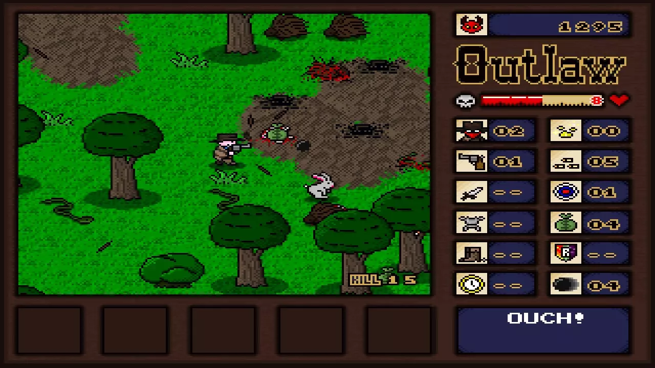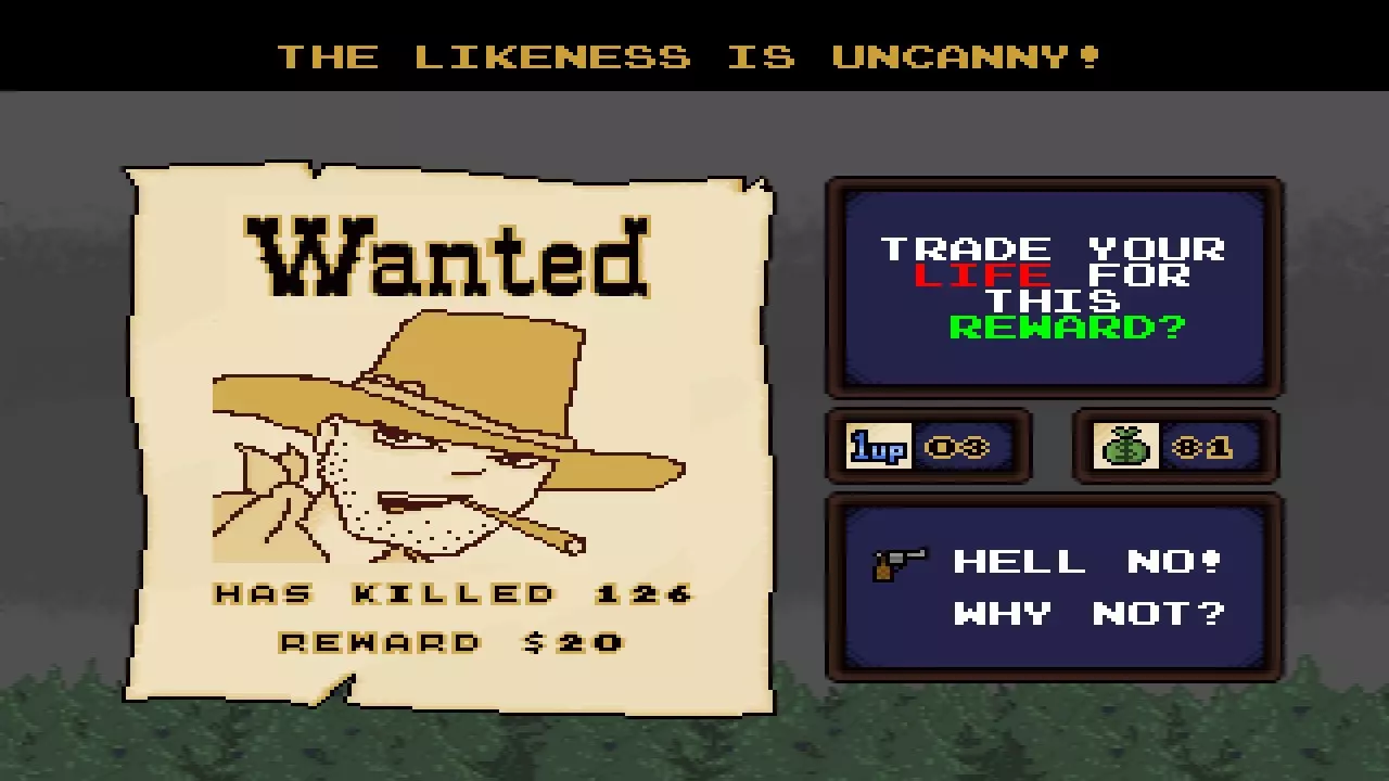 【牛仔头】爱心点数 这些点数用于驱动角色的爱心技能。每场游戏开始时你拥有3点。可以通过购买、在木箱中找到,或偶尔从宝箱或特定敌人处获得。 得分星星 这些闪烁的星星是得分倍增器,会随机出现在各种地方。别想歪了,不是你想的那种地方!它们会在短时间后消失。 金块 正如你所猜测的,这就是金块!打破岩石有时能找到不同数量的金块。偶尔也能在骷髅下面发现一些。每个金块可以卖给任何古怪的勘探者,价格在2到5美元之间。如果你能设法收集到至少20个金块,甚至可以和勘探者交换他的“特殊宝藏”,管他那到底是什么呢!战利品/钱袋 如果你觉得现在的钱很值钱,想象一下在旧西部时代会是什么样子!在那个年代,一栋房子大概只要100美元,简直离谱。总之,捡起一个钱袋可以获得1-3美元的现金。你可以在任何土匪商店或你可能找到的野外商店花费现金。你一次最多可以携带99美元。 药品(红瓶) 由一些城里来的医生混合的特制草药碎末和其他东西的小瓶。它确实有效,但每瓶只能恢复少量生命值。至少它们很便宜! 烈酒 在偏远地区的蒸馏器里酿造的温热瓶子装的东西,每个旧西部角色都喜欢这玩意儿。如果你扮演的是“醉汉”,喝一瓶烈酒还会额外恢复1点生命值。子弹 打开弹药箱可以获得子弹。子弹用于开枪。开枪是个好选择,不多解释! 弹药袋 有时你会在弹药箱里发现一整袋子弹(或者商店里有售卖)。捡起弹药袋会将你的枪械弹药补满,无论你最多能携带多少子弹。太棒了! 生命药膏(绿色瓶子) 拿起它可以立即治愈你可能因在野外摆弄尸体而染上的任何严重疾病。我是说,你当时在想什么呢? 蛇油(黄色瓶子) 直接来自江湖郎中,据传它能治愈从腹泻到男性秃顶的各种病症。喝下它总是一种冒险行为,因为它要么会完全回满你的生命值,要么会直接将生命值降至1点。【抗毒素(紫色骷髅瓶)】 喝下这个可以立即治愈你因招惹响尾蛇或踏入巨大闪烁的紫色沼泽而可能受到的任何中毒效果。 【马车轮】 击中其中一个马车轮,它就会疯狂地四处弹跳,持续对敌人和障碍物造成伤害,直到牛群回家* *或者直到它耗尽动力,后者可能性更大。 【亡命之徒】 亡命之徒