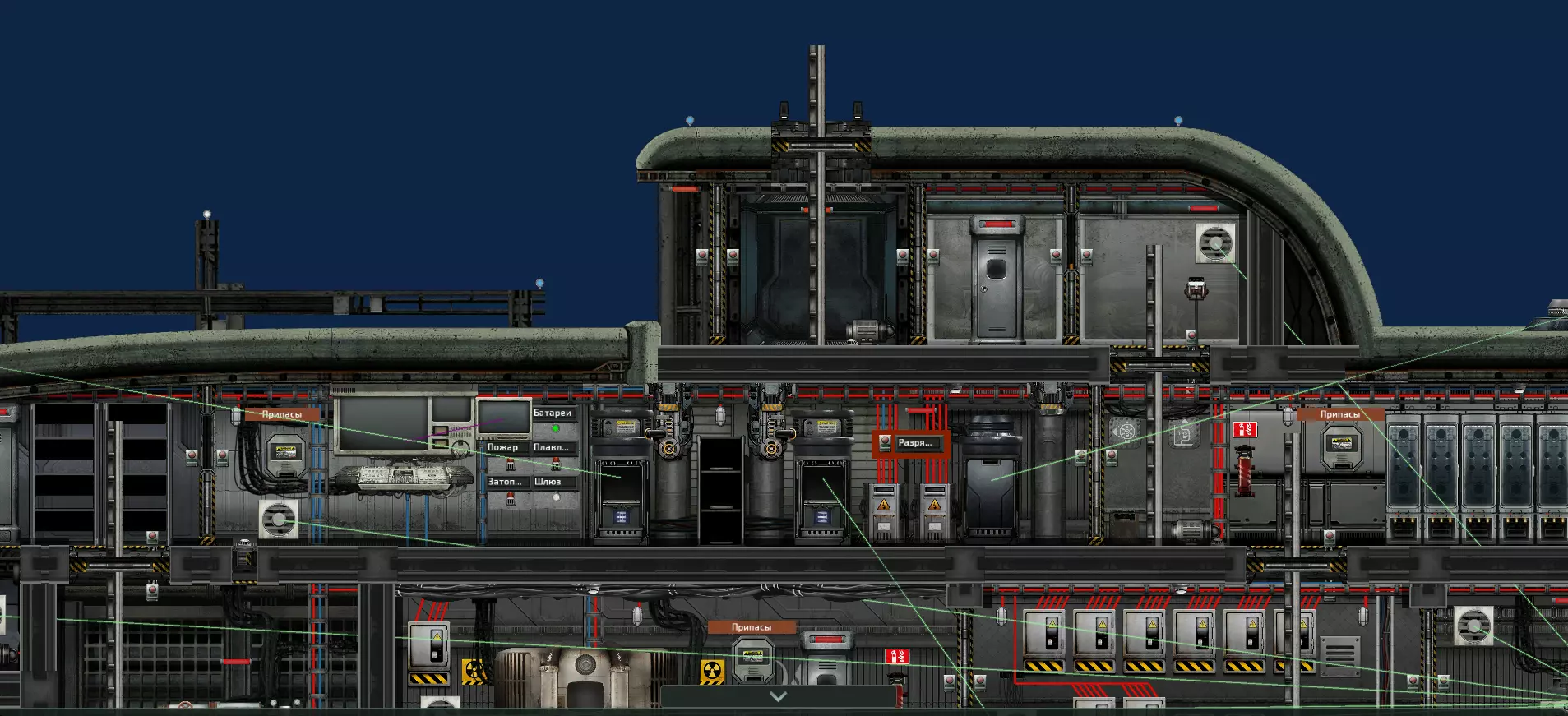 不过有一种极其复杂的方案:激活触发器时,会自动打开舱门和所有排水阀(这下肯定没人会去检查是谁的电力了),而舱门则会反被锁死!为此需要使用不同的【或】组件。在这种系统中,连接到排水阀和舱门的【或】组件会输出1(如果连接到泵的话则输出100)。而连接到舱门的【或】组件则输出0。反应堆爆炸 更新后,反应堆内置的自动化系统运行得非常好,只要它处于开启状态,就无法通过外部命令对其进行操作。但这对我们来说反而是件好事。我们可以将触发器连接到【或】组件上,并在其输出端设定一个值,比如10000。然后将该组件的输出端连接到反应堆的【设定裂变速度】功能上。只要自动控制杆处于激活状态,这就不会对反应堆产生任何影响。当混乱开始时,把它升起来就行。这会增加麻烦。不过我个人觉得反应堆爆炸太老套了,但作为混乱的补充或许还不错。 接管控制 关于进水的部分已经接管了水泵。而引擎需要单独预热,这样才能加速并狠狠地撞上去,增添点乐趣。没必要像处理氧气发生器那样复杂化,因为关闭的发动机会立即被发现。所以只需将上一步安装的【或】组件的导线连接到发动机的“指定动力”端子上。无论是自动驾驶还是手动操控都无济于事——潜艇会一直向前行驶,直到导线被扯断,或者更有可能的是,直到它撞上什么东西。最佳触发器方案 如果我们想让多个或所有动作同时执行,就需要通过一个通用触发器来驱动它们。如果只是用普通的杠杆,找到并按下它就可能将一切恢复原状。更好的做法是:在隐蔽位置安装一个写入了“1”的内存组件和一个继电器,用导线将内存组件连接到继电器的信号输入端。继电器通过按钮来关闭(详见(以上操作完成后),按钮即可移除。此后,你可以安全地用自己的线路图给潜艇布线,无需担心它们意外触发。在这种情况下,触发线路将由继电器信号输出端的线路充当。到指定时间,再次将按钮连接到继电器的【切换状态】端子,并按动一次按钮,从而启动所有系统。之后移除按钮。另一种方法是将“设置状态”端子连接到旁边同一内存组件的线路。或者连接到潜艇上某个重要设备的线路。只要该设备处于激活状态并发送信号,系统就会正常工作。 良心提示 指南中介绍的系统如果操作不当,很容易导致潜艇沉没。而在对通用触发器进行某种修改并在适当时候激活的情况下,可能会因自动激活而彻底损坏存档,并使潜艇陷入无法修复的状态(我不会详细描述具体操作方法。不应公开讨论这个话题)。但有时“玩得开心”以及那些由富有创意的背叛者引发的事件反而令人印象深刻(不像那些蠢货,他们只会乱开枪或者把4根控制杆插进非自动反应堆里——不过现在已经没法这么做了)。所以我呼吁大家要么在特殊模式下使用这些套路,要么就用在那些讨厌又有毒的人身上。毕竟,深渊蠕虫会给你公正的裁决。为了红鼻子的荣耀!Honk!如果你对能提升生活品质的民用电力系统感兴趣,我有一份详细说明潜艇电路方案的指南。