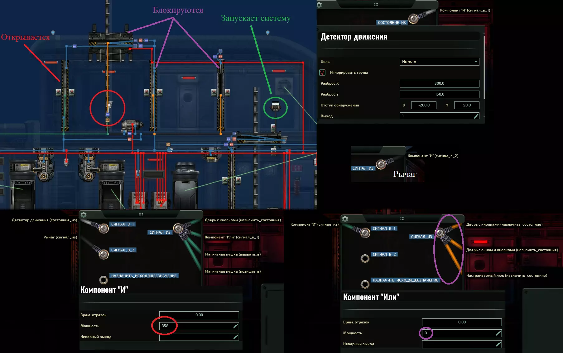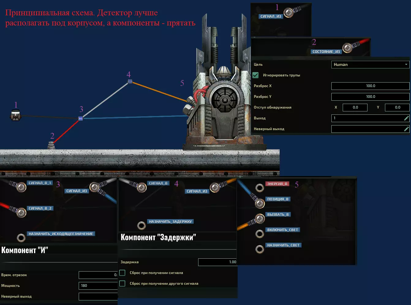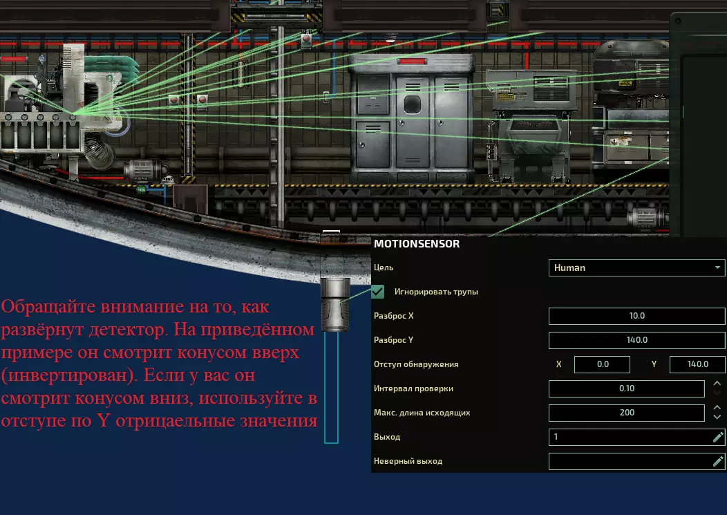 陷阱炮 潜藏着恶意的炮塔,准备向压迫者复仇。当有人进入其探测范围时,炮塔会转向目标并开火。与自动炮塔的区别在于,该炮仅对特定位置做出反应。不过其系统极为简单,安装速度也很快。建议安装在潜艇较长的水平上下部分,并在这些部分安装火炮,这样当火炮旋转到极限角度时,就能射击整个表面。探测器检测到人员后,火炮会转向并开火(见图)。最好将探测器安装在舱室内,并在给定参数下将其设置为最大可能的偏移量,否则它们可能会对在潜艇内走动的人员产生误触发。