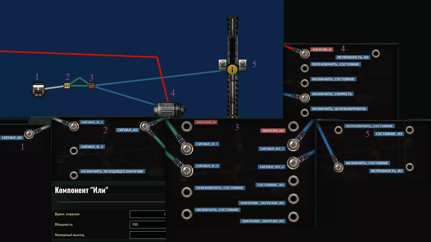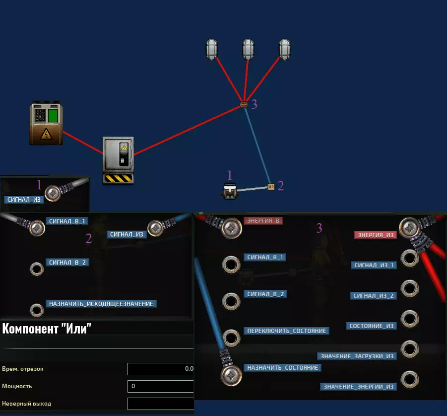 灯具 “黑暗的勾当就该在黑暗中进行”。而且总的来说,在黑暗中总是更有趣——你们懂的。关键在于,如果灯光突然熄灭,船员们将很难辨别方向和解决问题。因此,这种制造麻烦的方法能与其他方法很好地结合。最重要的是,潜艇上的灯光要通过技术上更完善的方案连接——即通过继电器,而非接线盒。在这种情况下,需要找到从电缆盒获取电力的主继电器,并将【或】组件的【设置状态】端子连接到主继电器的端子上,值设为0,然后再从触发杠杆引出导线连接到该【或】组件。这样一来,当杠杆被按下时,船只就会陷入黑暗,并且切换状态也无法恢复照明。不过要解决这个具体问题其实非常快。关键就在于这些额外的麻烦事。