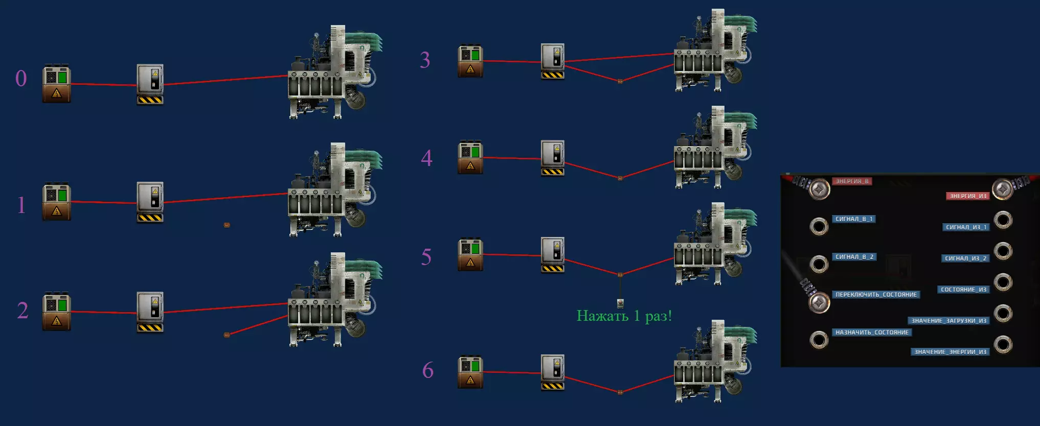 哪里获取零件 潜艇上可能存在资源短缺或严格管控的情况,可能会有人不让你使用制造机,或者对你的制造行为刨根问底,因此获取零件的最佳方式就是搜刮。灯塔上总能找到大量“多余”的电线,这些电线对灯塔的正常运行并无用处。如果你有幸遇到另一艘潜艇或深海潜航器,你会在那里找到所有必要的组件,因为我们只需要最常见的那些。别犹豫,用撬棍撬开储物箱——所有有用的电子元件都藏在那里。记住,内存组件可以用“与”门和“或”门组件成功替换,但需要正确输入数值并提供电源。氧气发生器 在游戏后期,潜艇完全可以在没有氧气的情况下维持相当长的时间——这得益于药物、随处可用的潜水服以及大量的氧气瓶储备。但在游戏早期或中期,尤其是人数较多时,氧气瓶数量不足且潜水服无法满足所有人需求,这种情况下很容易造成人员大量死亡。然而,仅仅切断高功率电缆是无法达到效果的。需要模拟供电状态。操作步骤如下: 0) 找到与氧气发生器相连的电缆盒(具体电缆连接到哪个端子,在端子旁边有标注) 1) 安装继电器(最好安装在不太显眼的位置,但同时也要确保从该位置跑到配电盘和氧气发生器的距离不会太长)2) 将电线从继电器的电源输出端连接到制氧机的输入端。 3) 将电缆盒(最好是连接到制氧机的那个)与继电器的电源输入端相连(如果盒子没有空间,直接断开连接制氧机的电线)。 4) 拧下制氧机和电缆盒上的旧电源线(如果尚未操作)。将其完全移除!它不应该悬着或掉在旁边! 5) 将按钮连接到继电器的“切换状态”端子。按一下按钮。 6) 拧下按钮和连接的电线。 完成!氧气发生器看似在通电,但与其相连的继电器处于关闭状态。潜艇开始缺氧!