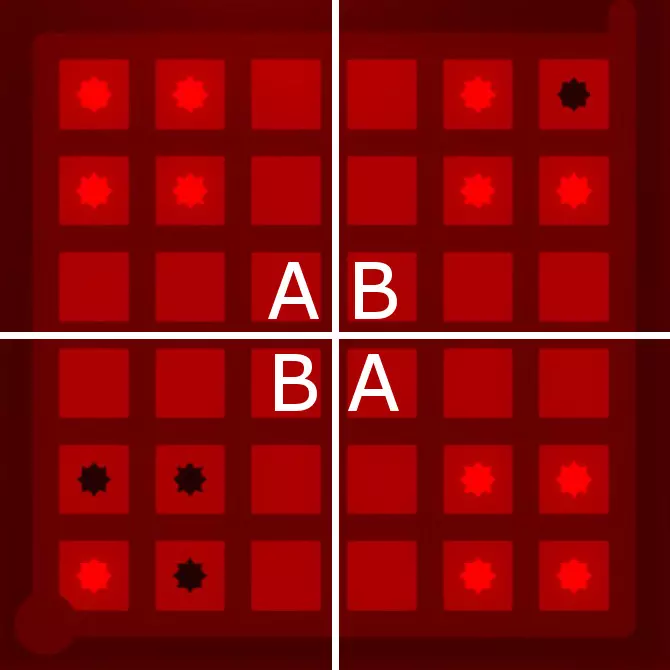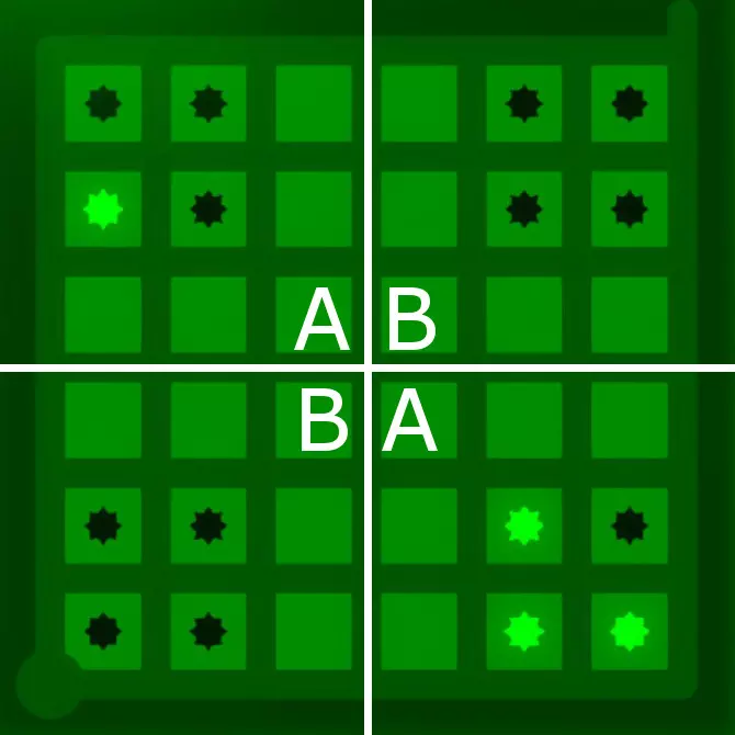 很明显,第1和第4区域的符号颜色必须与第2和第3区域的符号颜色不同。这就是从蓝色解谜图案中能推断出的全部内容。让我们将这一结论应用到绿色解谜图案中。 2. 绿色图案结论 这是绿色解谜图案,它具有相同的区域,但现在被标记为A区域和B区域,因为我们知道这两个区域的颜色必须不同。