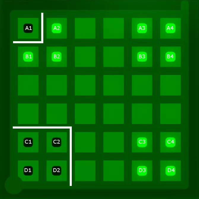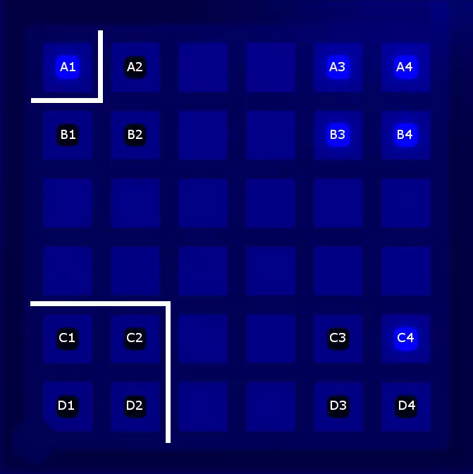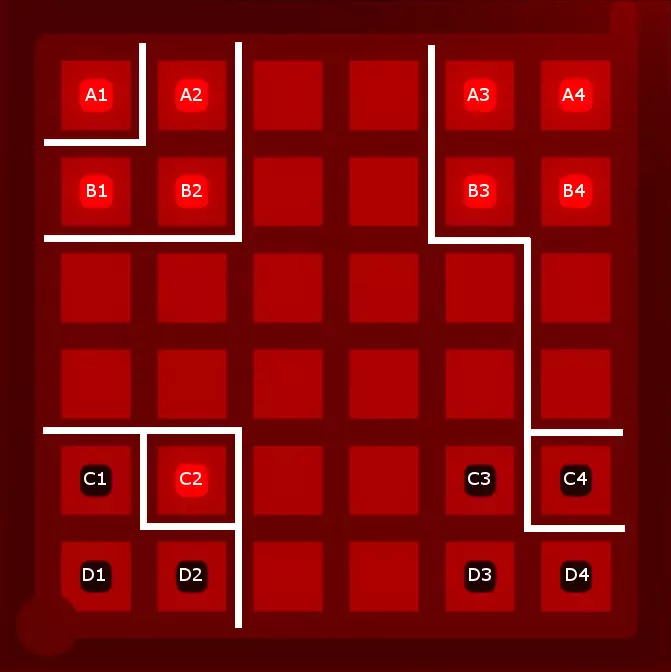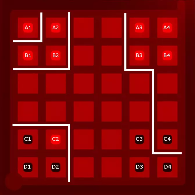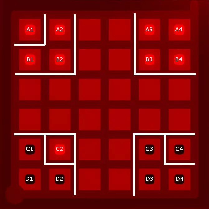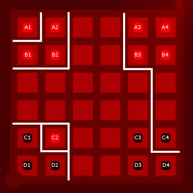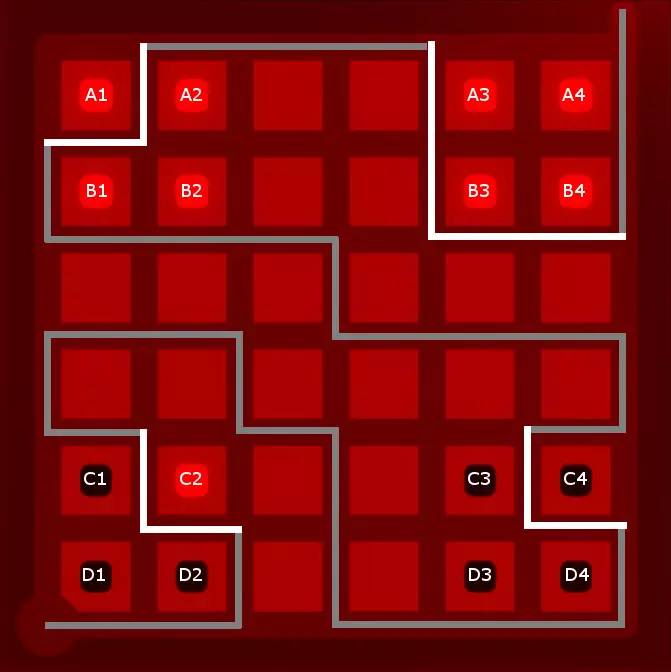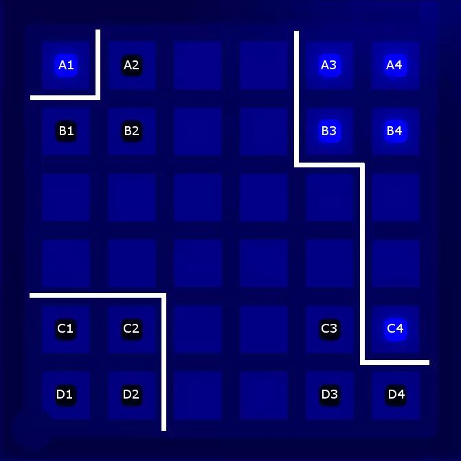好吧,被你发现了:我还保留了那条将A3、A4、B3和B4与其他区域分隔开的线,因为这条线能为找到最终解决方案留出最大空间。实际上,从逻辑上可以推断出这条线是所有三种图案的有效解决方案的一部分,但如果没有截图,我很难举例说明这种推断过程,而且我也不想让这份指南变得过于冗长。 5. 寻找解决方案 根据上述设置,你应该能够找到这个谜题的解决方案。我找到了两种可能的划线方式。请记住,你必须将三组三个方块以及角落的单个方块与所有其他方块分隔开。以下是一种可能的解法(剧透隐藏——若想查看,请将鼠标悬停在下方的黑线上):