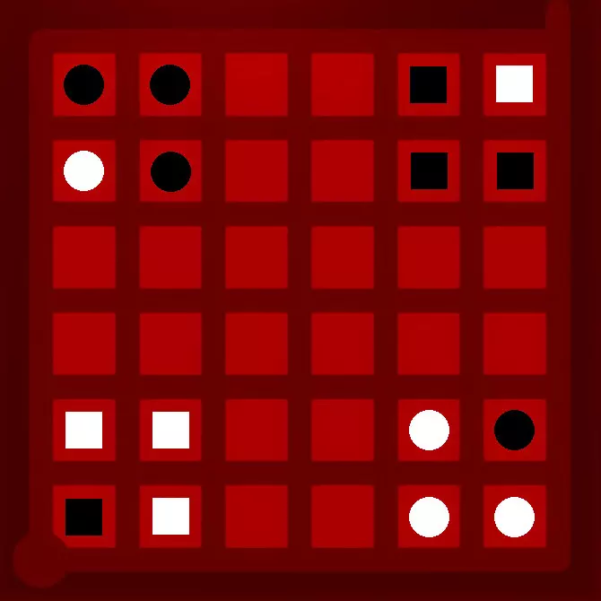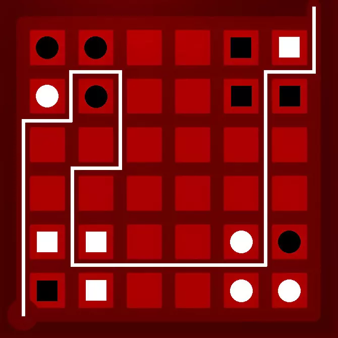 就是这样。每种形状和颜色的组合都代表一种不同的颜色。这里至少有四种不同的颜色。需要注意的是,目前还不清楚具体是哪些颜色。而且对于解谜来说,知道确切的颜色并非必要条件。你只需要知道存在三种不同的解谜图案,并且都必须满足即可! 现在你应该能自己找出答案了。如果还是不行,这里有一种可能的解法(再次提醒,以下内容含剧透——若想查看,请将鼠标移至下方黑线处):