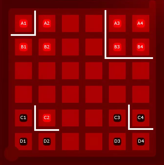 第一个结论可能是方块A1必须与方块A2、B1和B2分隔开。要实现这一点只有一种方法,所以我们来标记一下: