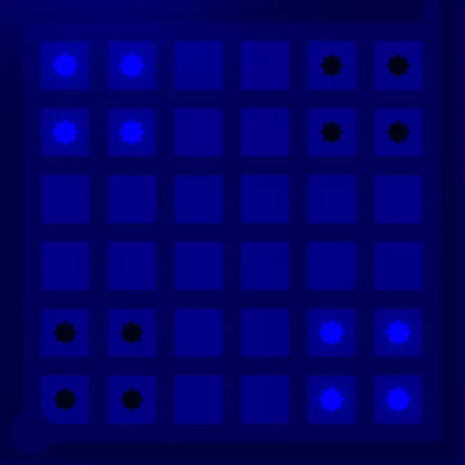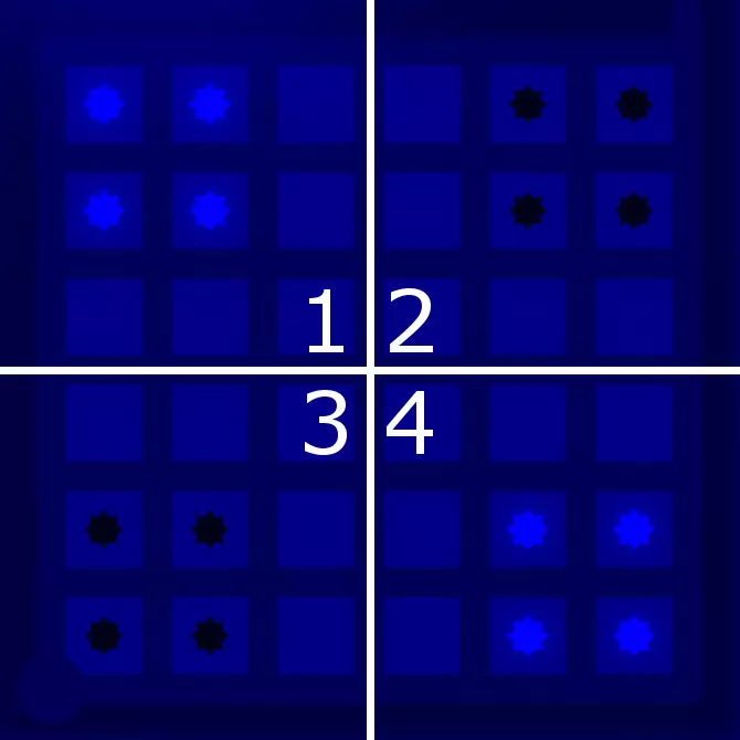 对于这个谜题,建议采用不同的方法,因为它的关键并非分离不同颜色的符号,而是将尽可能多不同颜色的符号组合在一起,即按照星爆规则,每组中每种颜色包含两个符号。只需几个步骤就能确定哪些符号颜色相同。 1. 蓝色图案结论 这是蓝色解决方案图案,共分为四个部分: