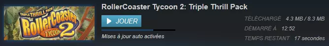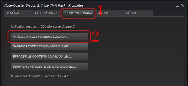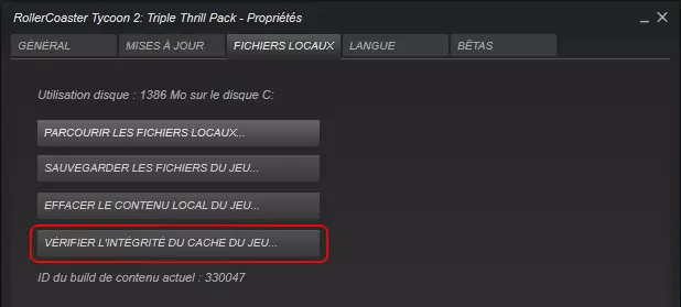 信息:实际上,Steam 现在会重新安装游戏的原始文件,因为安装程序已为你安装了缺失的文件,但主要是安装了英文版的游戏程序。因此,通过验证缓存可以将游戏程序恢复为法语。验证完成后,Steam 将下载一些缺失的文件。