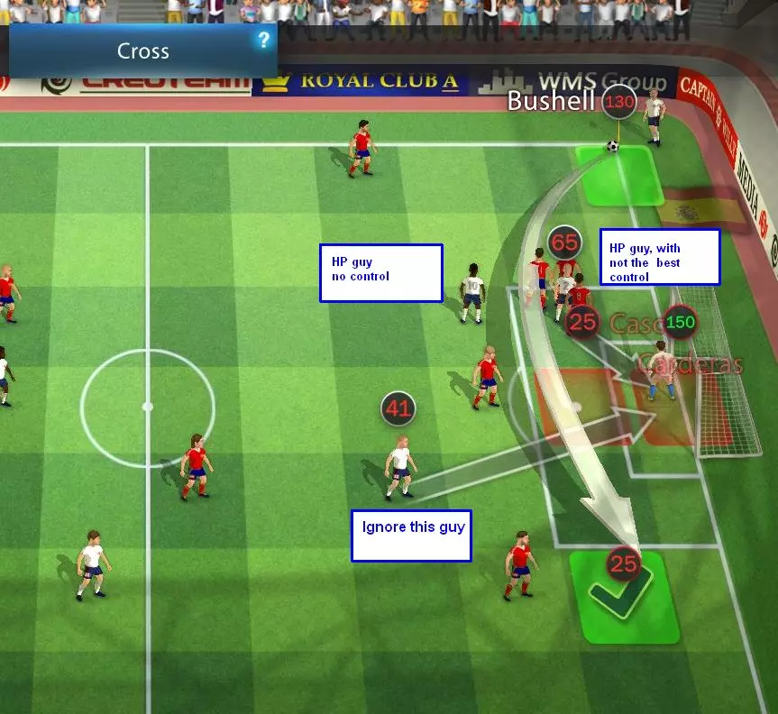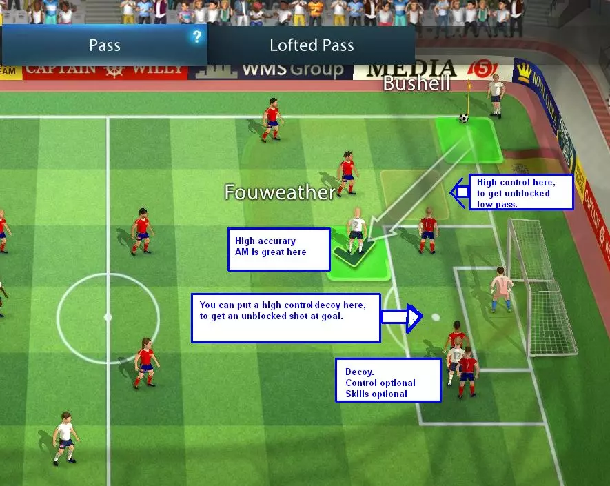“进阶”角球战术选项 大多数玩家在学习游戏基础时,在进攻角球时会采用非常简单的球员站位:一名球员在近门柱,另一名在禁区中路,然后选择传中、传球或高吊球。这种方式在很多情况下效果尚可。 这里提供一些其他可能更优的选项,以充分利用你的球员,并可能弥补他们的弱点。 注意:球员若要在禁区外完成头球,其头球天赋至少需要达到1级。 禁区外头球,双重选择。 将球员安排在禁区外中间三排的位置时,他们不会被对手从这些格子中挤开。这使得在角球时几乎可以确保获得头球机会。你仍然需要赢得争顶和头球判定,但绝不会被挤出位置。禁区外的头球会有距离惩罚,这使得它们的威力不如禁区内的头球。因此,这招最适合那些头球能力较高但控球能力较低、你不想让他们冒被挤出位置风险的球员使用。你会经常看到电脑AI使用同样的战术。