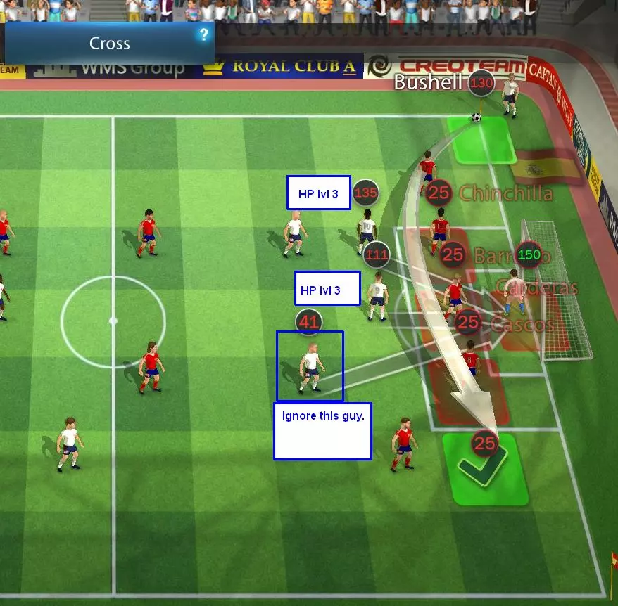免责声明: 这些截图是在热座模式下创建的。防守球员的站位有时是我个人会采用的角球防守站位,有时则是我预期电脑会采用的站位(我玩这款游戏的时间足够长,知道电脑在大多数情况下很可能会怎么做)。在实际游戏中,电脑实际的防守球员站位会有所不同。 在其中几张图片中,我将一名球员标记为【忽略这家伙】。他是一名未移动的中锋,但如果其他球员都没顶到球,他仍然有机会争顶头球。所以,或许不要完全忽略他,而是要注意到,仅仅通过初始阵型设置,你就可以让两名以上的球员在角球中获得头球争顶机会。 而且这些并非全部情况。某些特定情况可能需要考虑特定的解决方案。角球是得分的最佳机会之一,因此值得尝试并学会充分利用每一次机会。