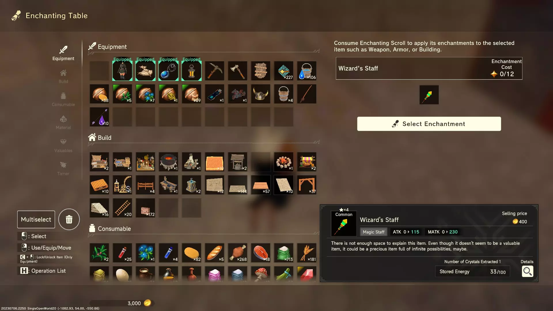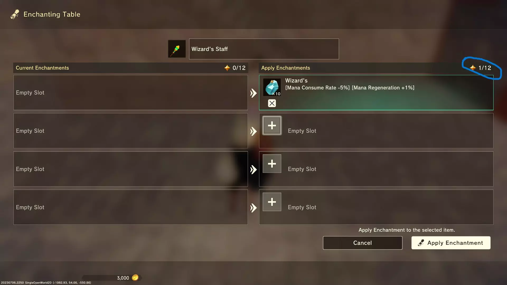 接下来的界面中,你将有四个插槽用于施加附魔。这里的情况会稍微复杂一些,因为每种附魔都有稀有度,而稀有度会增加附魔的消耗。稀有度还会影响施加该附魔所需的碎片数量。我在接下来的截图中圈出了消耗上限。 根据游戏内的帮助窗口,随着你进入不同的时代/纪元,这个上限会增加。你还需要注意每种附魔的碎片数量。如果碎片不足,附魔框会显示为红色,此时你无法施加该附魔。