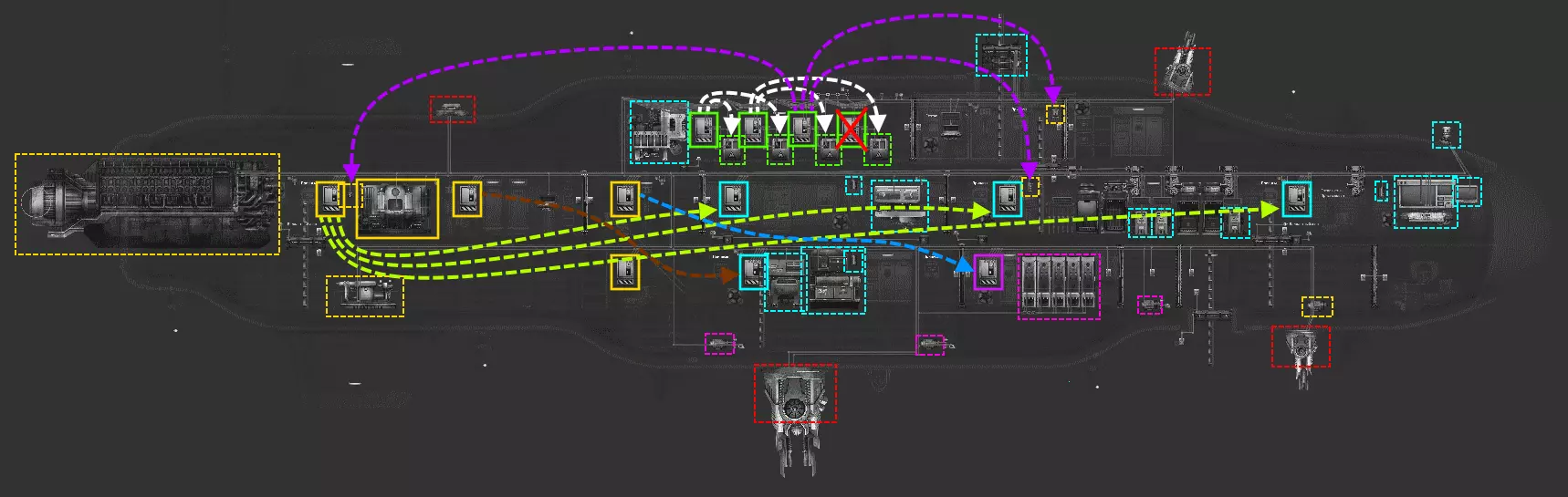 黄色护盾(引擎室) •反应堆右侧为主护盾,其损坏会导致潜艇瘫痪。 •引擎右侧为引擎护盾,为引擎及两到三个舱室的照明供电。 •梯子上方为第二主护盾,为电闸室及潜艇一半区域供电。 •梯子下方为压载护盾,仅为压载泵供电。绿色电闸(电力开关) •从左数第一个:下层甲板带电池的电闸;为引擎室和舱门区域供电。 •从左数第二个:医疗室带电池的电闸;优先级较低。 •从左数第三个:武器室带电池的电闸;维持潜艇的战斗能力。 •从左数第四个:舵手室带电池的电闸;维持舵手的状态。蓝色护盾(各处) •解构器附近——是引擎舱和舱门区域的护盾;对排水至关重要。 •医疗包附近——医疗舱的护盾;优先级较低。 •轨道炮附近——武器护盾;维持潜艇的战斗能力。 •导航员附近——伐木护盾;维持领航员的心情和氧气。 粉色护盾(舱门通道) •潜水服存放处附近——是下层甲板排水和氧气瓶补充的护盾。优化方案 如你所见,潜艇的一半电力由上层甲板的配电板供应。这些配电板与下层配电板的唯一区别在于电池的存在。可以通过将它们的维修优先级降至几乎为零,并缩短“驼背”号潜水器的修复时间,来去除这个可疑的多余环节。具体怎么做呢? 电机配电板为三盏灯供电,这些灯可以重新连接到配电板区域的任何一个配电板上。这样我们就能腾出空间来连接新的线路。之后,这些指示灯熄灭将不再表示发动机控制面板故障,而是表示上层甲板的控制面板故障。我们会在三个新位置安装任意蓝色控制面板,并缩短它们的线路。 这样我们将只剩下一个蓝色和一个粉色的长线路控制面板。其中一个可以连接到有空位的主控制面板,另一个则连接到泵控制面板。我个人将所有水泵连接到了楼梯下方的水泵配电板,而粉色配电板则连接到了楼梯上方的配电板。 在电气柜中,可以将一个配电板从电网中断开,把所有电池连接到另外两个配电板上,第三个配电板则专门用于照明。这样一来,楼梯上方的配电板就能腾出空间,同时还能减少需要维修的设备数量。关于电力供应的优化,就是这些内容了。