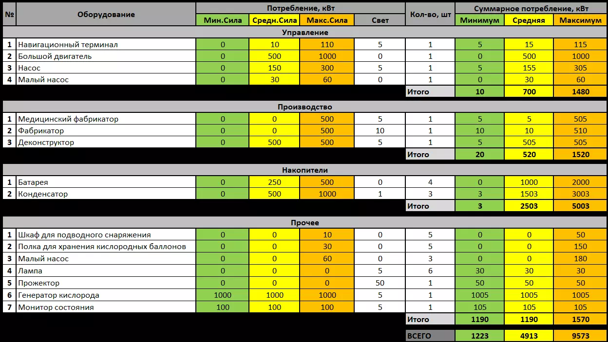 电力系统参数 电力消耗 几乎所有设备都包含消耗能源的电力元件和照明元件。部分设备的耗电量是变化的:分阶段变化(发动机、泵、电池和电容器),可关闭(制造机、探照灯、声呐、储物柜和潜水员置物架)。其他设备则为恒定耗电量(制氧机、灯具和照明元件)。以下表格中考虑了三种情况:最小、中等和最大消耗量。游戏中最小和最大消耗量的情况较为罕见且短暂,因此中等消耗量最接近实际游戏过程。甚至可以说实际消耗量更高,因为在深渊中武器不会停止开火,而只要领航员在躲避敌人,制造器就不会停止供应弹药。经过几项网络改进后,“驼背鲸”理论上参数完美。