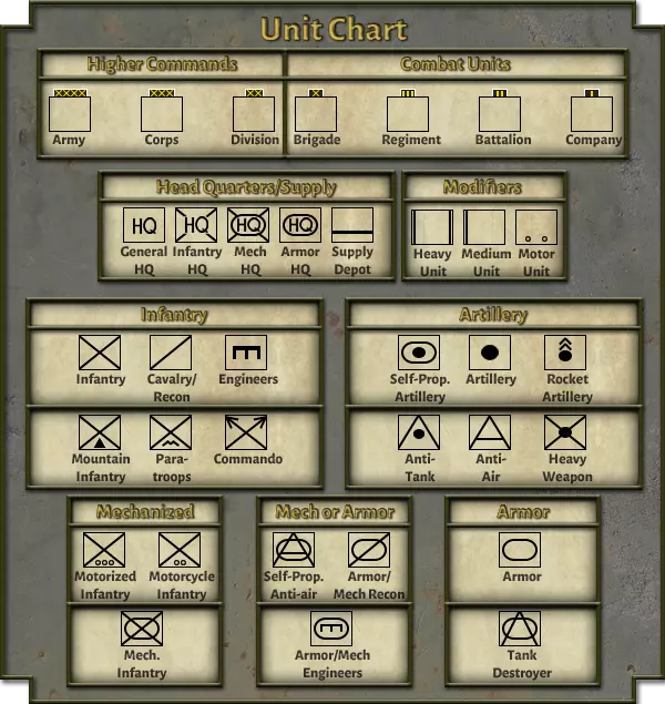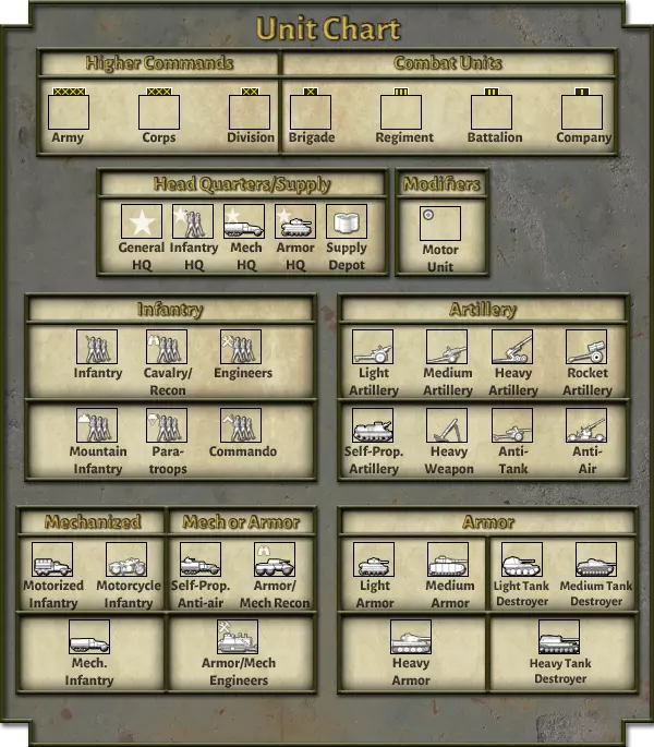 7.1.1. 友方空域专属效果: 两栖登陆:两栖登陆只能在友方空域内发起。注意,若你成功登陆后,对手获得了海滩区域的制空权,则在该 hex 的制空权处于争夺状态或更优状态前,你将无法登陆额外的增援部队。有关两栖登陆的更多信息,请参见 8.2 节。 空降:伞兵空降只能以友方空域内的 hex 为目标。若你想在敌后空降,需派遣足够的战斗机将敌方的空中区域击退。 敌方空中任务效果降低:敌方在你的空域内执行空中支援、打击及轰炸任务的效果会降低。 7.1.2.友方与争夺制空权 突击队登陆:突击队单位可在友方或争夺制空权区域执行两栖登陆。 7.2. 制空权: 掌握制空权能让你干扰敌方空中任务、保护己方任务并扩大空中区域。执行制空权任务的航空大队将争夺制空权,而其他所有中队则执行更专业的任务,如空中轰炸、打击、空中支援、地面遮断和侦察。 7.2.1. 制空权总值判定: 每个执行制空权任务的航空大队,每回合的空战强度计算公式为:(空中武器属性×士气×制空权任务数量×凝聚力)。空降兵着陆时会遭受伤亡和凝聚力损失,使其容易受到敌方的即时反击。不过,部分伤亡人员会在后续回合中自动归队。不同国家和年份的伞兵类型的伤亡/归队统计详情,请参见6.8.3节。 策略:由于着陆区域的不确定性以及空降伤亡风险,通常明智的做法是避免将伞兵投放在强大敌军单位附近,或距离接应部队过远。你不会想陷入“遥远的桥”那样的困境。 8.1.1. 空降限制: 空域控制:伞兵空降只能在友方空域内进行(参见7.7.1节)。地形:山地或沼泽 hex 无法下令空降,但如果空降兵的选定着陆区邻近山地或沼泽,他们仍可能意外偏离航线并最终降落在这些地形类型中。 8.1.2. 空降散布:正常情况下,空降兵会降落在指定目标周围一格半径范围内。但敌军单位的存在会使空降兵进一步偏离。若空降单位恰好降落在敌军单位上,空降兵将被转移到附近的空 hex,距离目标着陆区更远。 8.2. 两栖登陆:8.2.1. 常规登陆:常规两栖登陆包括放置登陆标记,然后在标记周围 6 hex 范围内选择最多 8 个登陆滩头。只有位于友方空域内的海滩才可以被选择(参见7.1.1节)。除了在部署标记的回合突击海滩的部队外,海滩在3个回合内仍可供增援部队登陆,或者直到敌方部队占领该海滩为止。如果使用得当,入侵者可以在几天内通过一整套8个海滩部署整个军级部队。然而,常规登陆绝不可能做到隐秘,因为防御方在指定的入侵海滩被激活后,即使没有直接目视到登陆区域,也能看到这些海滩。 两栖作战:两栖登陆是【联合兵种作战系列】中强度最高的战斗。当登陆部队遭遇海滩防御时,他们会不顾一切地在每个行动阶段发起攻击,无论胜算如何,直至占领海滩、被摧毁或回合结束。如果登陆部队在战斗中出现撤退判定,他们会像被包围的部队一样自动损失15%的兵力,但仍会继续攻击。尽管入侵部队会受到两栖作战惩罚并面临高伤亡风险,但他们也能获得强大的海军炮火支援加成(详见8.2.2节)。 登陆失败:未能占领海滩但未被摧毁的登陆部队会自动返回部署区,并在登陆期间遭受的损耗之外,额外损失50%的凝聚力。 8.2.2. 海军炮火:两栖登陆可获得海军弹幕和火力支援加成。在两栖登陆的第一个阶段,海滩会遭受海军炮火的轰击,并且在登陆的每个阶段,海军火力支援都会被计入进攻方的战斗值中。海军炮火/火力支援的数值因国家而异,但在每种情况下,都是根据普通轻巡洋舰和驱逐舰的火炮投射量计算得出的。 8.2.3. 突击队登陆:突击队可以在友方或争夺中的空域内任何地点进行登陆,无需海滩登陆标记。除非对手的单位对突击队的登陆区域有视线,否则他们不会知道你的突击队已经登陆。突击队登陆仍会消耗增援点数。 8.3. 入侵后勤:8.3.1.【增援点数】:增援点数代表部署作战单位所需的海军或空中后勤资源。进行两栖登陆、突击队登陆和伞降部署单位时,均会消耗增援点数。部署一个单位所需的增援点数与其堆叠值相等。 【策略】:若规划不当,增援点数可能会成为入侵部队的严重瓶颈。需考虑在下一个增援周期(通常每3回合一次)前计划部署的单位数量,并据此购买额外的增援点数。若部署栏中的单位因缺乏增援点数而无法登陆,在下次补给阶段购买到更多增援点数前,这些单位将难以发挥作用。港口:在入侵场景中,任何位于海滩格子上的城市或城镇都被视为港口。若入侵方玩家占领港口,他们可以在该格子继续部署增援部队,无需消耗登陆标记。不过,在港口部署部队仍会消耗增援点数。 策略:大多数港口城市同时也是大型补给站,入侵者通常会在入侵初期尝试占领一个港口,以简化其后勤保障。 8.3.3. 两栖登陆堆叠限制例外:每回合在单个海滩格子中最多可登陆5个堆叠点,而非通常的4个堆叠点。 策略:面对有防御的海滩,利用登陆时额外的堆叠点限制来部署更多装甲部队或炮兵,确保登陆部队具备联合作战能力。对于无防御(或防御薄弱)的海滩,可利用这额外的堆叠点数让指挥部和炮兵部队上岸,否则它们将不得不额外等待一回合才能登陆。 附录1:地面部队图表 附录1a:地面部队图表(北约符号集)负责争夺制空权的每个航空大队的空战力量将被汇总,以确定一方的总空战值,并与敌方进行比较。你对敌方的制空权优势越大,敌方空中任务被攻击或损失的数量就越多,你方任务被攻击或损失的数量就越少,且你