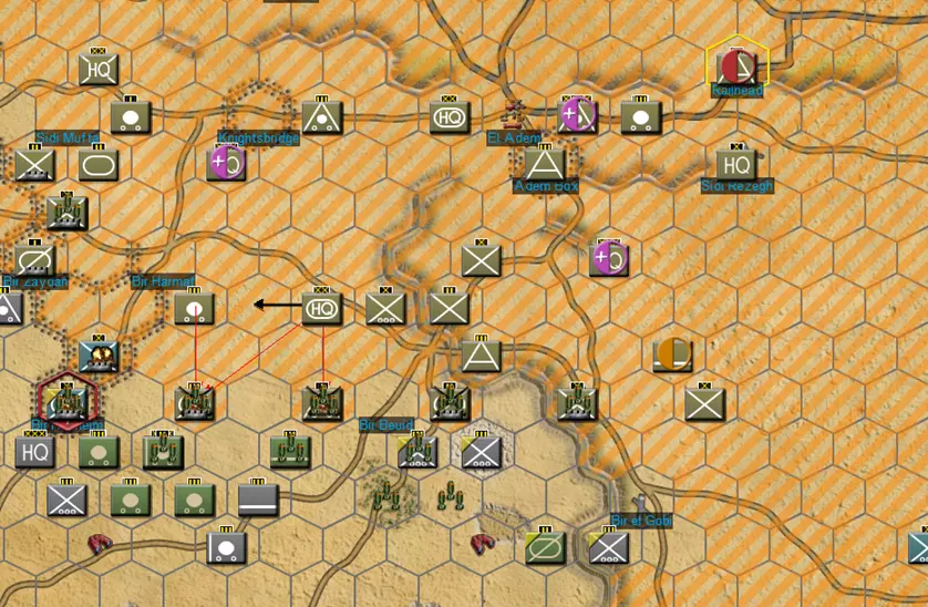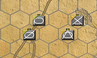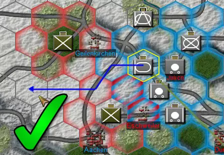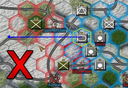 单位卡片可让你快速查看关键信息,包括当前命令、堆叠值、名称、上级指挥部名称、兵力、战斗值、火炮数据以及反坦克值。更多信息请参见3.4.1节。 1.5.3. 编组按钮:点击编组按钮可将选中的单位合并为一个战斗群(受堆叠限制)。你也可以通过在底部栏将单位卡片拖放到另一个单位卡片上来组建战斗群。更多信息请参见3.3节。 1.5.4. 空军按钮:空军指挥部负责管理空中编队,而空军按钮则允许你在地图上部署空中任务。点击空军按钮会调出空中命令菜单。可用任务会显示在括号中,例如,在下方截图中,我们有3个空中轰炸任务和2个空中侦察任务。选择你想要执行的任务类型,并在地图上放置【目标】。 取消空中任务:若要取消空中任务,点击空中任务按钮,然后右键点击地图上已规划的空中任务【目标】将其移除。 2. 核心游戏概念 2.1. 行动阶段:CAOS每回合包含10个移动/战斗行动阶段,从阶段0到阶段9,分别代表一天中的不同时间,旨在回合制环境中模拟实时移动。双方下达命令后,所有单位同时移动并战斗。因此,敌方行动和友军单位相互阻挡都可能延迟或扰乱你的计划。例如,敌方空袭可能会阻止炮兵支援关键突破,或者一支重要的坦克团可能会被友军步兵阻挡而无法到达目标位置。正如真实战斗一样,在【联合兵种作战系列】中,计划在实际执行时很少能完美展开。优秀的指挥官会根据突发挫折和意外胜利进行调整与临场发挥。 2.2. 堆叠机制:每个六角格有4点堆叠限制。具体来说,标准团级单位价值2堆叠点,营级单位根据规模和类型不同,堆叠点在0.5-1之间,因此一个六角格通常可同时容纳2个团或4-8个营。 4点堆叠限制仅在两种情况下可被突破:1) 游戏开始部署阶段,堆叠限制暂时失效。2) 在回合结算时沿道路移动,堆叠值上限提升至6。若某一格在回合结束时堆叠点数仍超过4点,超出的单位将自动被驱逐至相邻格。 2.3. 控制区:每个堆叠点数为1或以上的单位堆,会向周围格子投射控制区(ZoC)。通常情况下,单位可以进出敌方控制区格子,但不能在敌方控制区格子之间移动。详见下方示例图。 敌方控制区(标红处)会阻止此移动,因为我们正尝试在两个敌方控制区格子之间移动。