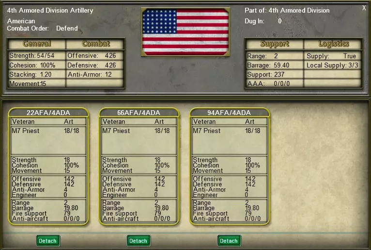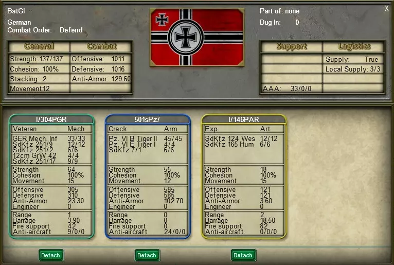 通用详情:除了重申部队卡片上列出的所有信息外,详情表还会显示移动值、防御状态、防空能力(分为低/中/高海拔)、部队是否正在接收补给以及携带的备用补给可维持的回合数。 营级详情:部队的每个附属单位都有自己的营级卡片,列在详情表的下半部分,显示各个下属单位的名称和战斗数据。可以通过营级卡片下方的相应按钮将营级单位从其上级单位中分离或重新附属。另外需要注意,当部队执行休整命令时,每个营级卡片下方会出现一个补充按钮,允许它们在有可用补充点数的情况下接受补充。注:营级单位卡片会根据其单位类型进行颜色编码。蓝色=装甲单位,青色=机械化单位,红色=步兵单位,黄色=炮兵单位,橙色=防空单位。 3.5. 武器卡片:点击营级单位卡片上的武器系统名称,即可查看该武器系统的各项具体数据。点击后将打开所选武器的武器卡片。