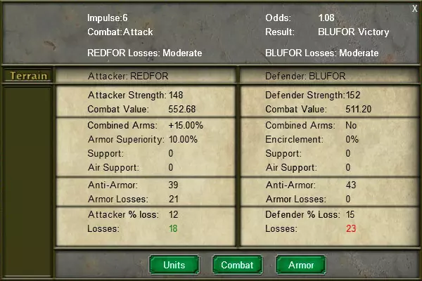 可以通过点击地图上的战斗标记(交叉步枪图标)或顶部栏的战斗总览列表来查看详细的战斗报告。战斗报告弹窗会显示战斗的所有关键信息,包括战斗几率、战斗修正值和损失情况。底部的【单位】【战斗】和【装甲】按钮可打开额外界面,让你查看参战单位名称、近战阶段的详细损失以及装甲战斗阶段被压制的装甲单位。 4.1. 战斗阶段: 4.1.1. 装甲战斗: 在装甲战斗阶段,双方会使用各自的反坦克值来压制敌方装甲。被压制的载具在近战阶段只能发挥一半的攻防值。通过适当集中反坦克能力,可以显著降低敌方大规模装甲部队的威胁。 确定装甲压制效果:反坦克值越高,敌方装甲点数被压制的程度就越大,但反坦克效果会有所不同。例如,同一支57毫米反坦克炮营在重复进行相同战斗时,压制的四号H型坦克数量并非每次都完全相同。 装甲和韧性属性的作用:装甲更厚重的车辆需要更多精力才能被压制。例如,压制一辆虎式I型坦克所消耗的反坦克总值,是压制一辆四号H型坦克的两倍。同样,韧性属性高的车辆也很难被压制。行军战斗通常强度较低,每场战斗的损失相对较少,但可对突破敌军防线或歼灭被包围单位产生毁灭性效果。在理想条件下,一个行军单位在一回合内最多可发起九次战斗。行军命令在地图上以浅红色移动线标记。 策略:使用行军命令推进接敌,侦察敌军弱点,或通过多次行军命令打击被包围的敌人,以期达成追击效果。 5.2.2. 防御性行军:这是行军命令的一种变体,单位仅在敌我兵力比达到或优于10比1时,才会与路径上的敌人交战。防御性行军命令在地图上以黑色移动线标记。策略:当你不想冒意外战斗的风险时,使用防御行军。 5.2.3. 强行军:强行军比普通行军命令移动得更远,但只能在道路格子间移动,且无法发起战斗。强行军的部队会因敌方空中遮断、轰炸和炮火而遭受额外损失,并且会陷入混乱状态,若在本回合剩余结算阶段受到攻击,其战斗值将降低50%。强行军命令在地图上以黄色移动线标记。 策略:当你拥有空中优势且不担心敌方伏击时,使用强行军在后方区域快速调动部队。 5.2.4. 攻击:主要的高强度战斗命令。执行攻击命令的单位在指定行动阶段抵达目标 hex 时,会与所有相邻的敌方单位交战,并获得 20% 的战斗加成。攻击会导致双方都承受更高的伤亡,但只要优势足够大,就更有可能迫使防御方撤退。在前往目标的途中,执行攻击命令的单位会像执行常规行军命令一样与敌方部队交战。攻击命令在地图上以暗红色移动线标记。 策略:使用攻击命令突破敌方前线,为后续部队创造可利用的缺口。 5.2.5. 袭扰:执行袭扰命令的单位会在回合结算期间骚扰所有进入其相邻 hex 的敌方单位。被袭扰命令攻击的单位可能会遭受伤亡,并且在其下一次移动时会受到 +1 的地形移动成本惩罚。每个武器系统都有其独特的【遭遇战修正值】,该修正值会在遭遇战中对【战斗值】和【反坦克值】进行调整。例如,速度较快的M18“地狱猫”坦克歼击车拥有显著的遭遇战加成,而速度较慢的“虎王”坦克则会受到严重的惩罚。遭遇战修正值可在武器卡片上按武器系统单独查看。通常情况下,装甲压制对轻型装甲车辆(如装甲车)的影响更大,而重型装甲巨兽被压制的可能性要小得多。当重型装甲车辆被压制时,它们会不成比例地削减敌方剩余的反坦克单位池。 地形对装甲战斗的影响:部分地形类型(如森林和山地)会提升进攻方和防守方双方的反坦克数值。同样,部分建筑(如城市或加固阵地)也会提升防守方的反坦克能力。 4.1.2. 近战:装甲战斗结束后,近战阶段开始。近战是战斗的决定性阶段,胜负(或平局)将在此阶段决出。进攻方的进攻战斗值与防守方的防御战斗值之间的比率被称为【战损比】,它决定了双方遭受的损失以及战斗的最终结果。 确定伤亡:如同传统桌面战棋游戏,近战伤亡根据战损比按比例确定,并在合理范围内随机产生。和现实中一样,【联合兵种作战系列】中的战斗本质上是不可预测的;在3比1的战损比情况下,你可能会遭受3%的伤亡,而如果重新进行该回合,同样的3比1战损比可能会导致6%的伤亡。 韧性的作用:如武器卡片部分所述(参见第3节)5)具有【韧性】的武器系统在伤亡分配阶段有一定百分比的几率忽略针对它们的击杀判定,转而将损失转移给韧性较低的单位。 【突破攻击】:若近战中的兵力对比为进攻方15比1或更高优势,则防御部队立即被摧毁,且进攻方不会产生伤亡或移动成本。 4.2. 战斗修正: 4.2.1. 【联合作战】:联合作战在近战阶段显著提升攻防战斗值。联合作战通常是可用的最强大战力倍增器,玩家应尽可能争取联合作战加成。 4.2.2.联合作战等级:联合作战的强度会根据部队组成而提升,最高可获得+50%的加成。达成最基础的联合作战等级,需要战斗中同一方同时有步兵和装甲部队参与。加入炮兵和空中支援可进一步提升此加成。 步兵+装甲+炮兵+空中支援=+50% 步兵+装甲+空中支援=30% 步兵+装甲+炮兵=+30% 步兵+装甲=15% 联合作战的最低步兵数量要求:战斗中部队至少15%或30个兵力点必须为某种形式的步兵,才能满足联合作战的步兵要求。合成兵种的最低装甲数量要求:在战斗中,部队中至少15%或30点兵力强度必须为某种形式的装甲单位,以满足合成兵种的装甲要求。 合成兵种中炮兵的特殊考量:只有具备射程数值且属于炮兵类型