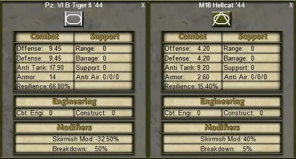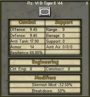 3.5.1. 通用武器数据:武器卡片会显示所选武器的基本信息,例如攻击力、防御力、射程、弹幕、支援、防空和工程学。这些数值以“原始”形式显示,未经过训练或凝聚力的修正。 3.5.2. 特殊武器数据:武器卡片还会显示特殊数据,如装甲值、韧性、近战修正值和故障率。 装甲值:压制该武器所需的反坦克值。只有坦克、半履带车等装甲战斗车辆才有装甲值。 韧性:在装甲战斗中该武器系统不被压制,或在近战中受到伤亡判定时不被摧毁的百分比概率。 策略提示:韧性不会减少你在战斗中遭受的总伤亡数。如果武器成功通过其韧性检定,那么将对战斗中涉及的另一友方武器进行相同的“击杀骰”判定,通常是韧性较低的武器,如步兵。在可能的情况下,将装甲部队与步兵搭配,可将伤亡从宝贵的坦克转移到更易消耗的步枪兵身上。 小规模战斗修正值:该修正值表示武器在小规模战斗中获得的百分比加成或减益。侦察单位、突击队以及诸如装甲车之类的高机动载具通常拥有较高的小规模战斗修正值,而重型装甲则会受到严重的小规模战斗减益。 故障概率:该武器每消耗1个移动点时发生机械故障的百分比概率。机械故障会导致额外的凝聚力损失。训练等级较低的部队以及耗尽补给的部队,在遭遇崩溃时会遭受更大的凝聚力损失。 4. 战斗 CAOS中的所有战斗分为两个阶段:1) 装甲战斗阶段,在此阶段装甲车辆会被压制;2) 近战阶段,在此阶段部队的兵力值会被摧毁,战斗结果也在此阶段决定。虽然基础的进攻、防御和反坦克数值构成了战斗系统的基础,但众多战斗修正值会对战斗结果产生影响。