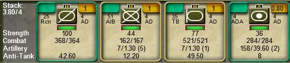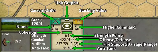 战斗群堆叠规则:一个战斗群最多可包含3个堆叠点或7个单位。注意,由超过2个堆叠点的附属单位组成的战斗群在组建后将缩减为2个堆叠值。这体现了在单一指挥结构下整合不同单位所带来的战术控制力提升。 战斗群与师级指挥加成:来自不同师的单位可以组合在一起,但要注意,当它们与其他师的单位组成战斗群时,将失去师级指挥加成。 3.4. 单位卡片和单位详情表: 3.4.1. 单位卡片:单位卡片是快速参考卡片,当选中地图上的单位堆叠时,会显示在屏幕底部。单位卡片会显示一个单位最重要的战斗数据,包括当前指令、堆叠值、简称、上级指挥部简称、图标、大致凝聚力、兵力、攻防战斗值、火力支援、弹幕、火炮射程以及反坦克值。