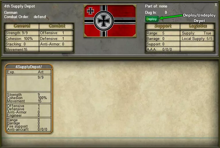 当补给覆盖层激活时,补给网格会以橙色斜线标记。补给源以红色半圆标记,移动仓库以橙色半圆标记,延伸器以紫色半圆标记。 2.5.2. 补给单位: 静态补给源:静态补给源是取之不尽的补给来源;它们不会被耗尽或摧毁,所有其他补给单位必须追溯一条补给线回到补给源,以避免耗尽自身的补给储备。当补给覆盖层激活时,补给源会以红色半圆标记。 移动仓库:移动仓库是将补给网格扩展到静态补给源范围之外的主要手段。不过,移动补给站必须先部署才能提供补给;部署/取消部署按钮位于补给站的详情面板中(见下图)。如果移动补给站与静态补给站的补给网络断开连接,它将携带5回合的补给量,可与自身补给网络内的所有友方单位共享。当补给覆盖层激活时,已部署的移动补给站会以橙色半圆标记。