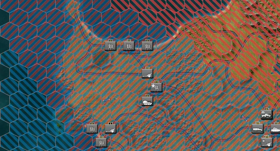 控制区域覆盖层:控制区域覆盖层会显示友方和敌方的控制区域(ZoC)。友方控制区域标记为蓝色,敌方控制区域标记为红色,而争夺中的控制区域则以蓝红条纹标记。
