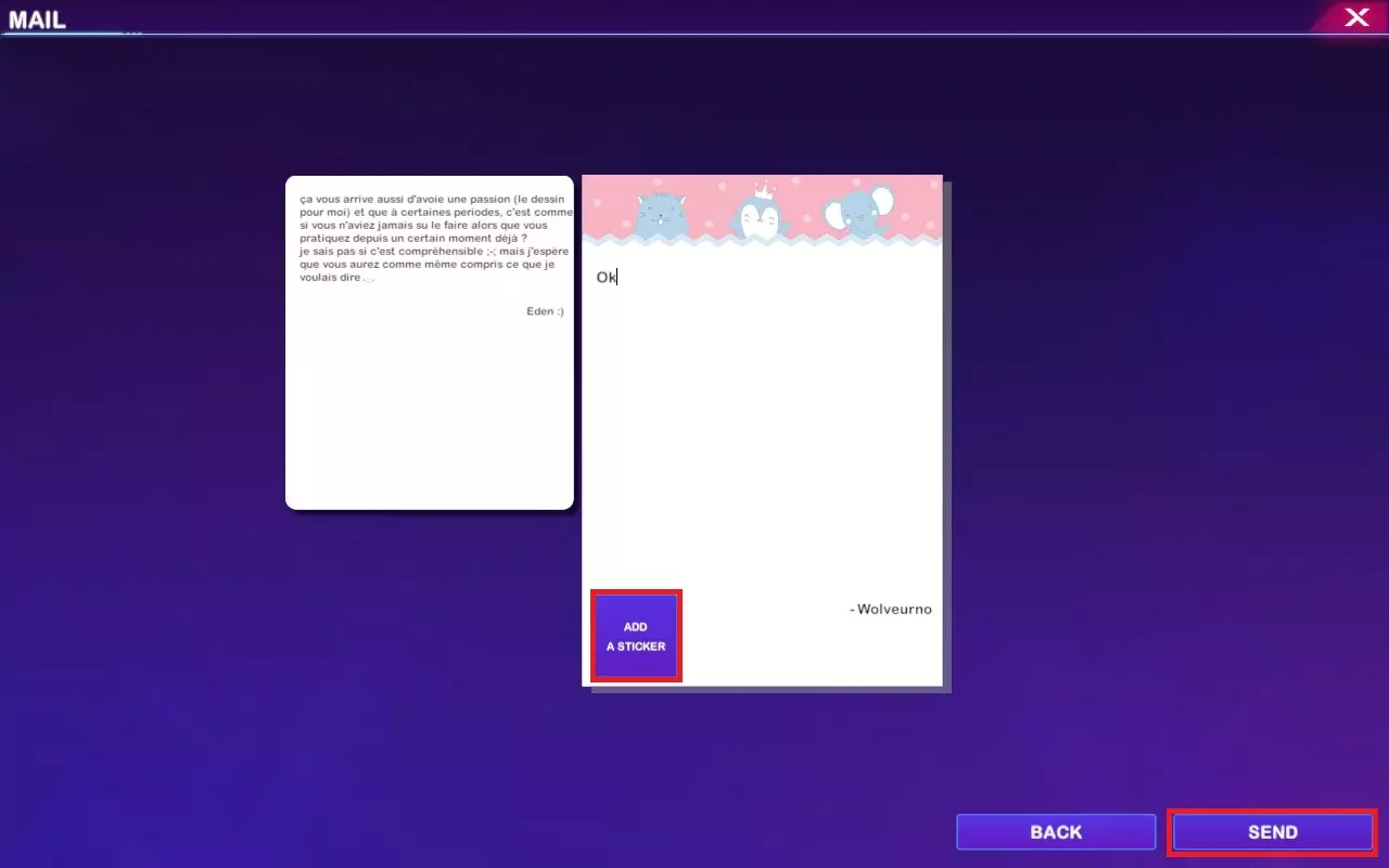 在空白区域输入文字并点击发送(你可以点击添加贴纸,解锁贴纸并添加到消息中以获取Small Gift成就,解锁所有贴纸可获取Sticker Collector成就)。