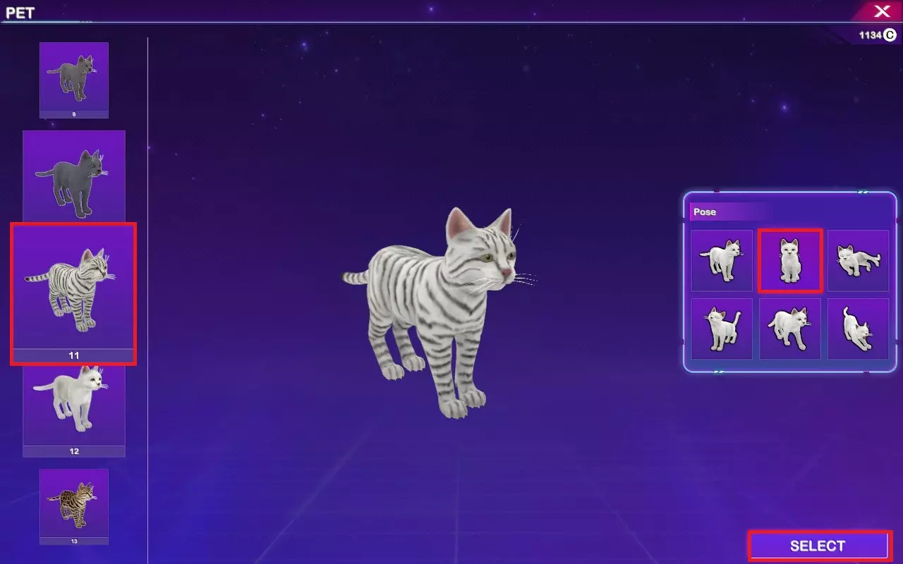 用鼠标上下滑动,选择可用的宠物(被锁定的为DLC内容)和姿势。