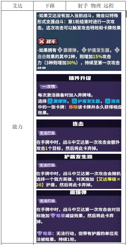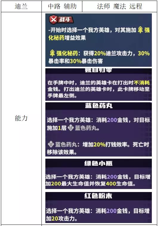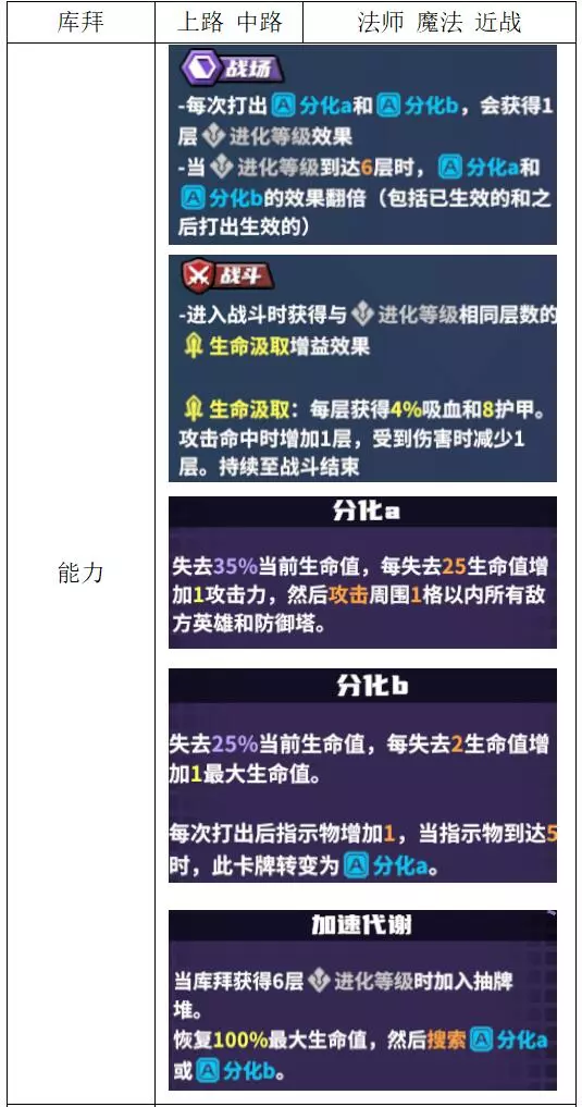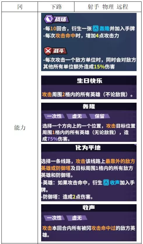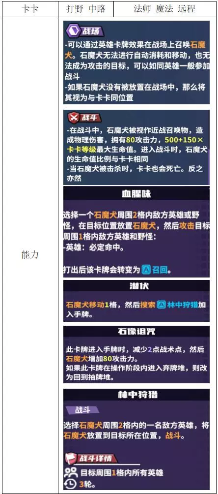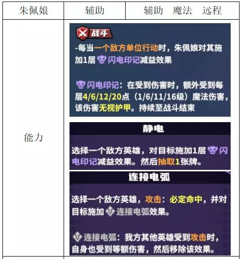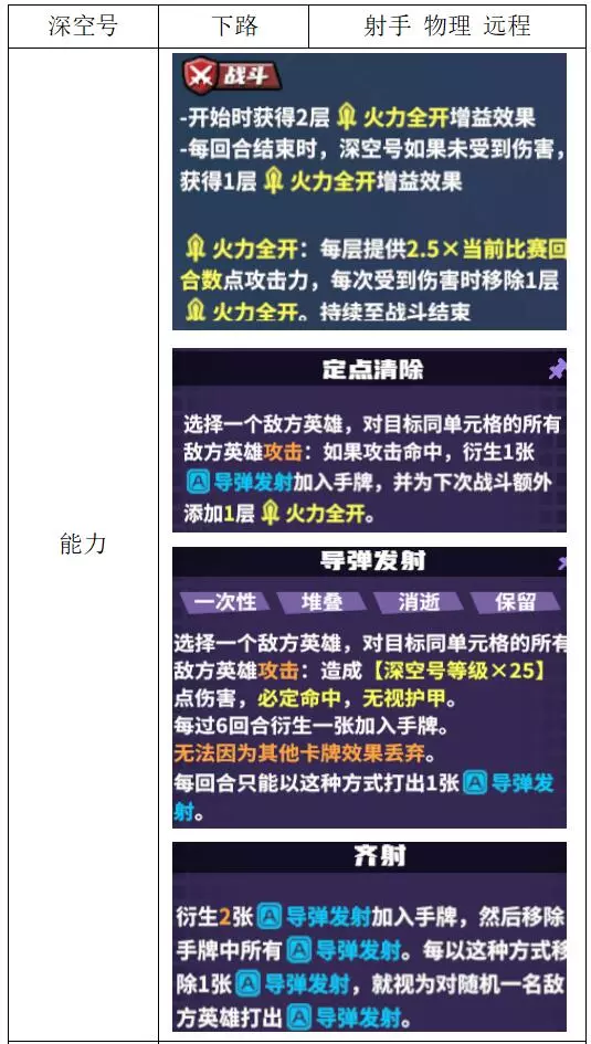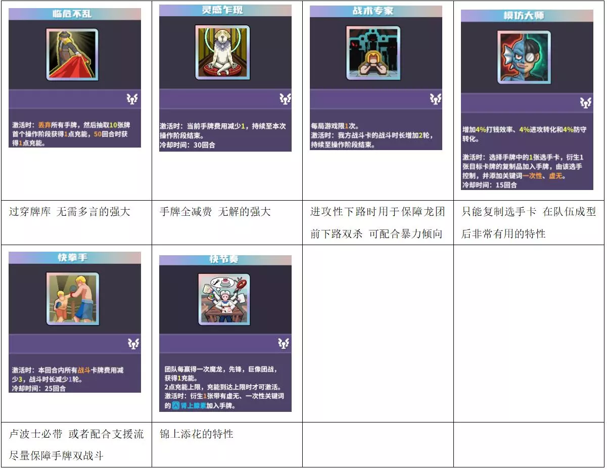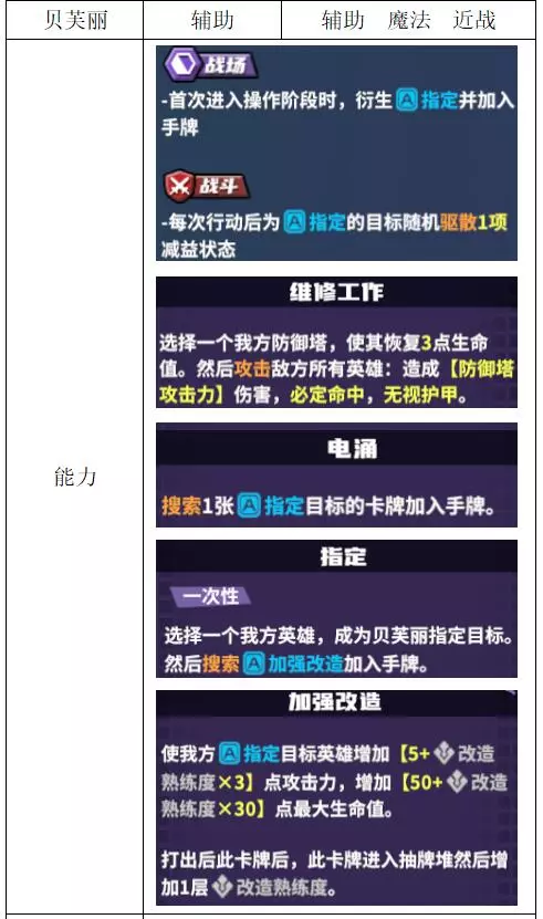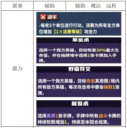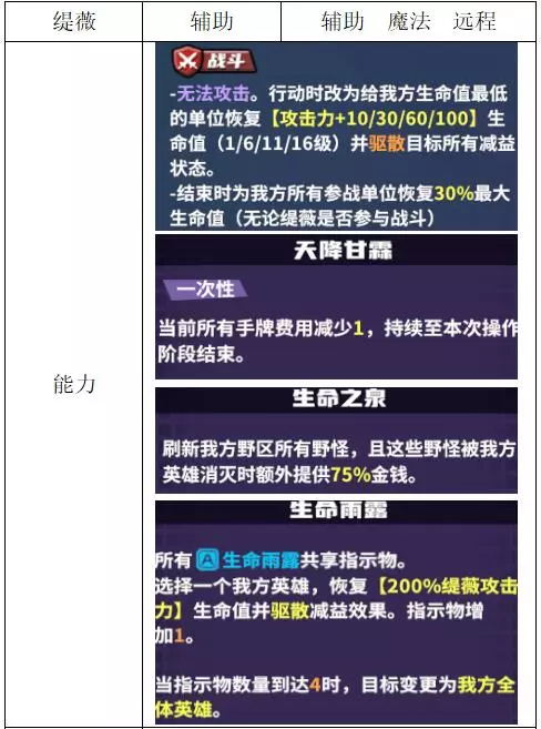 关键词:抽卡、检索、弃卡、增伤、治疗 评价:优秀。非常全能的进攻型辅助,大团配合群伤或多动都非常强,过牌和检索能力突出。唯一缺点是完全没有防守性,容易被集火击杀。 战斗特性推荐:上路/中路(放养位)。完全贴合的特性不多,可使用通用功能特性。