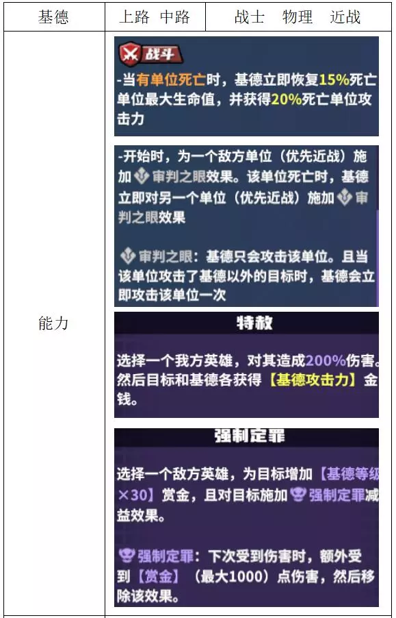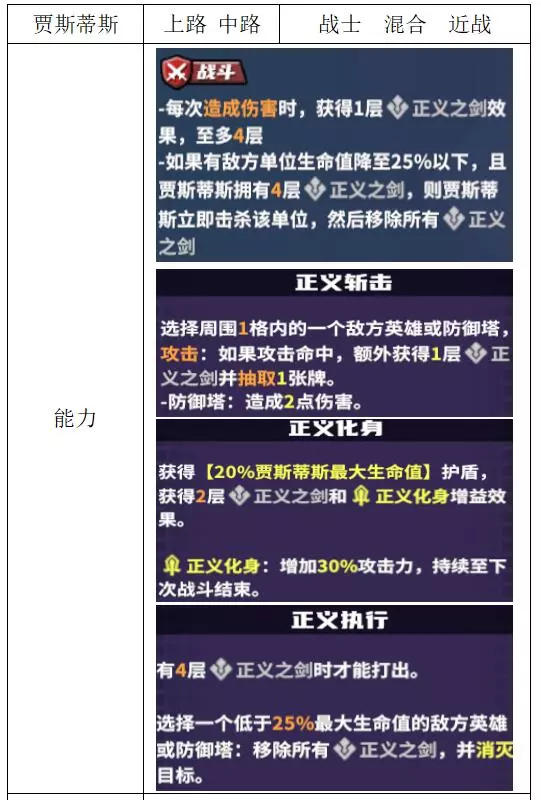 关键词:回点、抽卡、加盾、支援 评价:良好。支援型上路,适合保护下路核心使用。加强后功能性更强,但在大规模团战中作用单一。 贾斯蒂斯