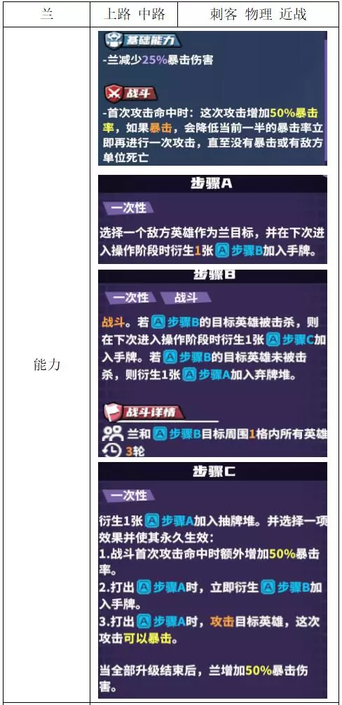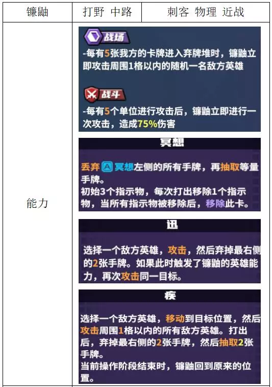 关键词:收割、机动、弃牌 评价:良好。收割型大团野核,配合群伤可快速完成收割,但作为刺客前期没有机制上的增伤能力,前期很弱。 兰