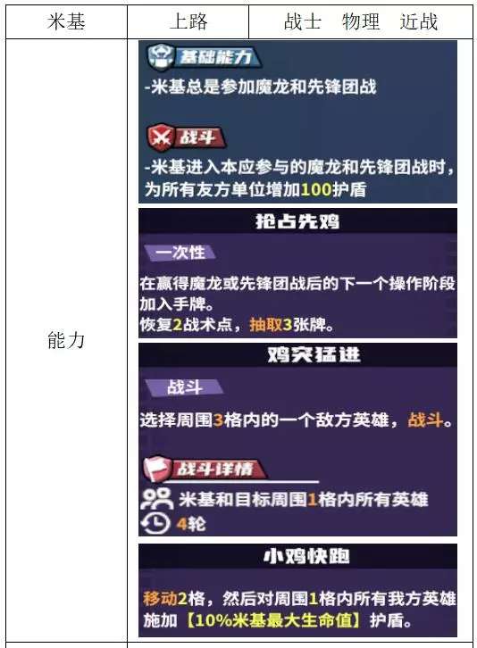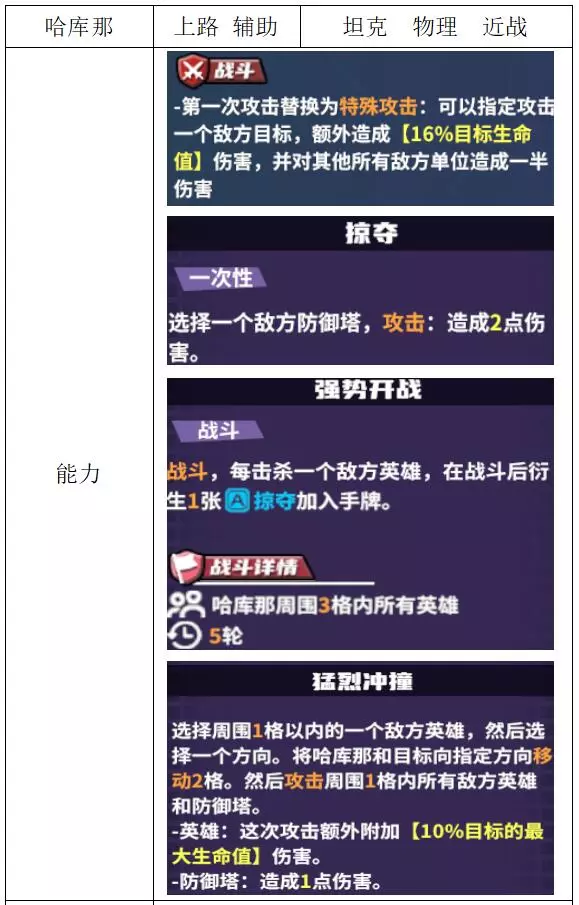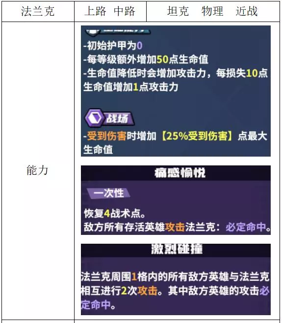 评价:一般。该英雄属于开团型大团英雄,战斗中开启团战的能力除了对【法兰克】效果较好外,整体表现一般。