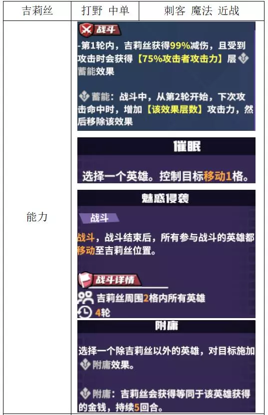 关键词:支援、决死 评价:良好 纯粹的对单刺客,小团战王者。但因没有机动卡,操作体验不够顺畅。在大型团战中能稳定造成关键一击,适合与其他斩杀型输出配合使用。 吉莉丝