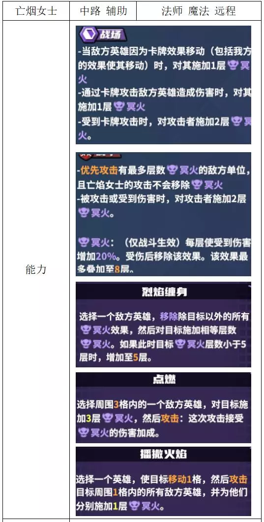 关键词:增伤 评价:一般。纯挂件增伤的进攻型辅助,主要作用是能为法师提供珍贵的暴击属性,也可用于其他特定需要暴击的英雄,例如兰、小鱼人。 英雄:亡焰女士