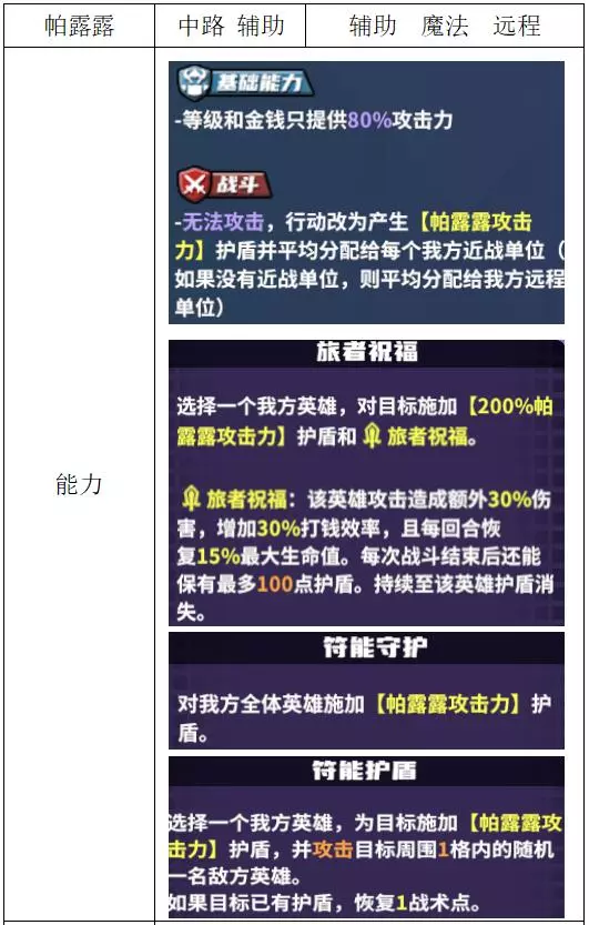 关键词:修塔、增伤 评价:良好。非常强的单保型辅助,通过直接强化核心位数值达到保护作用,攻守兼顾。 角色:帕露露