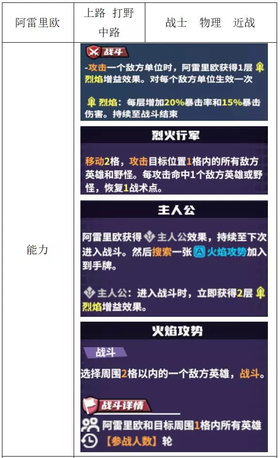 关键词:开团、反弹 评价:良好 最经典的开团型上路,不吃任何控制,想跳就跳。但没有其他功能,目前更倾向于反弹对面铁皮人、大脚、虎娃等减益效果的对策卡 阿雷里欧