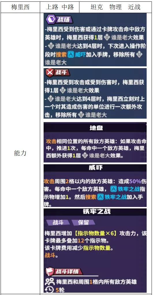 关键词:嘲讽 评价:一般 高贵的嘲讽坦克,加天赋后可拥有5次嘲讽效果,能用于克制大团开门爆发,但不具备其他功能,在没有其他选择时可拿来纯挡刀使用。 梅里西