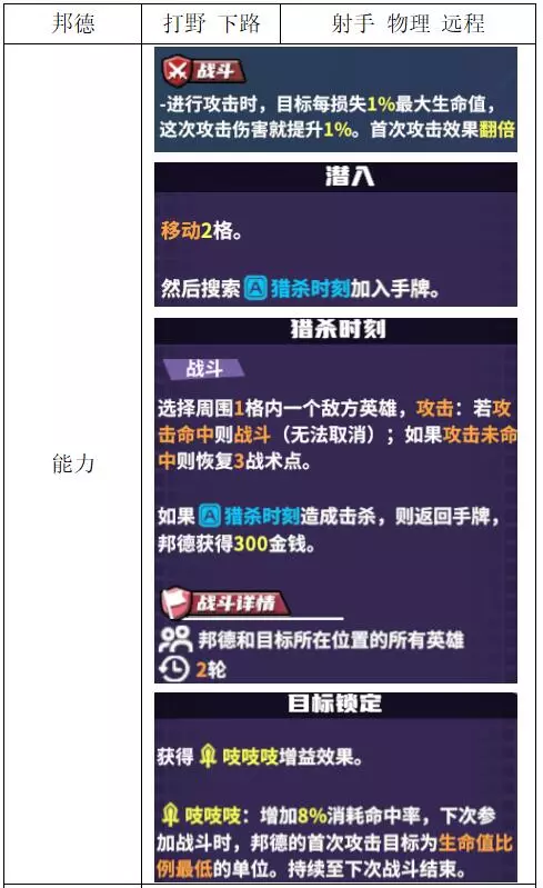 关键词:技伤 评价:一般 战场输出射手,加强了对下路的伤害,但成长性较低,依然不是优秀的下路选择 邦德