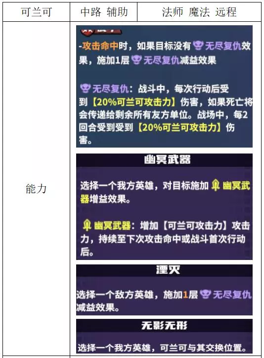 关键词:群伤、拉人 评价:优秀的群伤核心,团战表现出色,也是清理召唤物的能手。具备拉人能力,有一定防守性,建议搭配可提供护盾的英雄使用。 可兰可