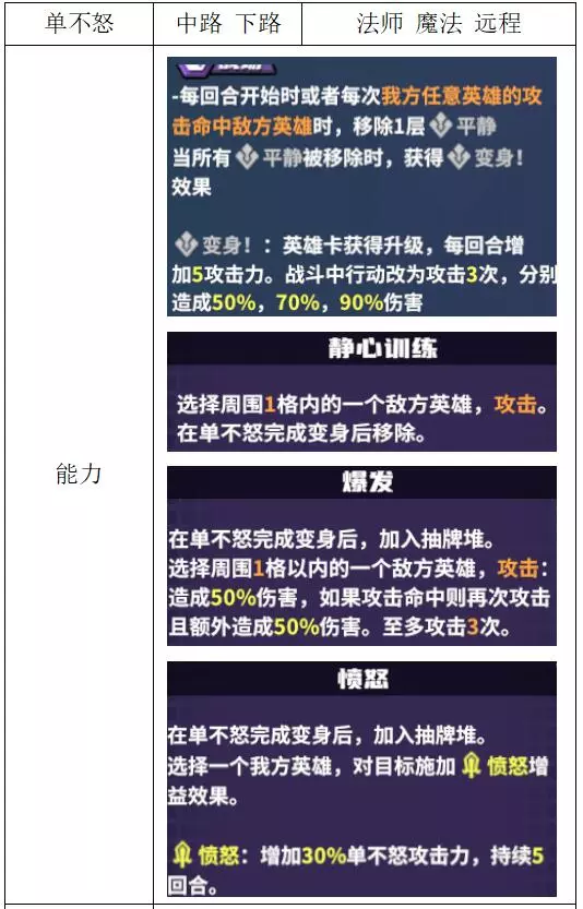关键词:开团、多动、爆发 评价:优秀 全图开团型刺客,由于具备全图支援能力,所以直接走上路发育,配合其他支援型中野进行下路四包二。完全体状态下可以开门3-5刀,甚至能秒杀战士。 4-法师 单不怒