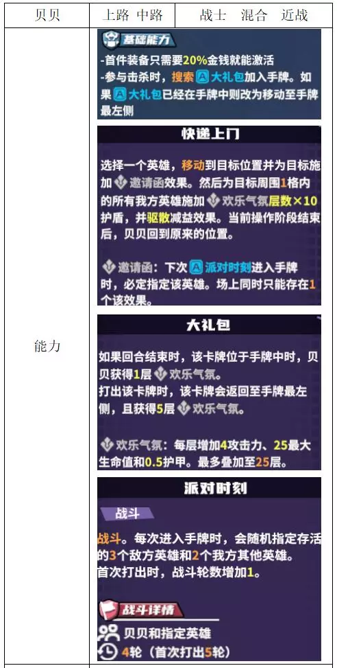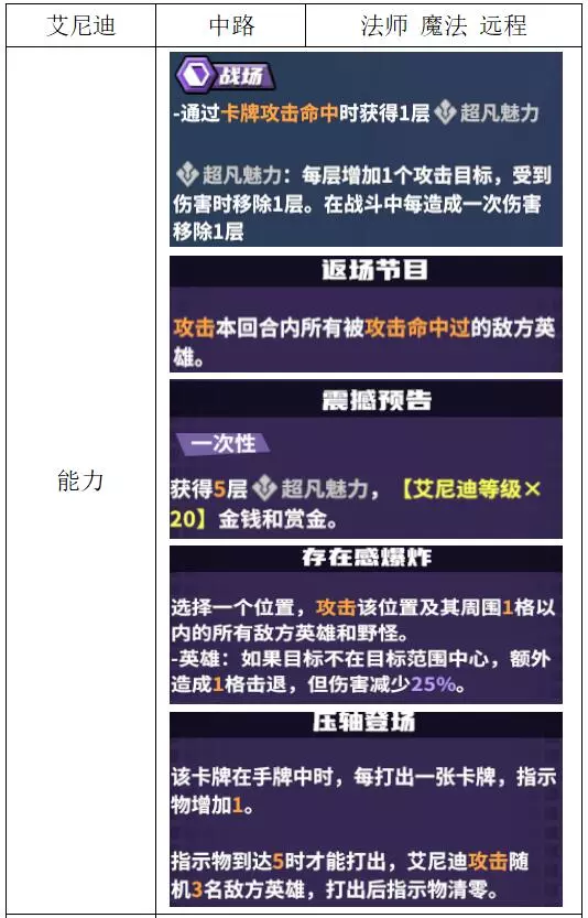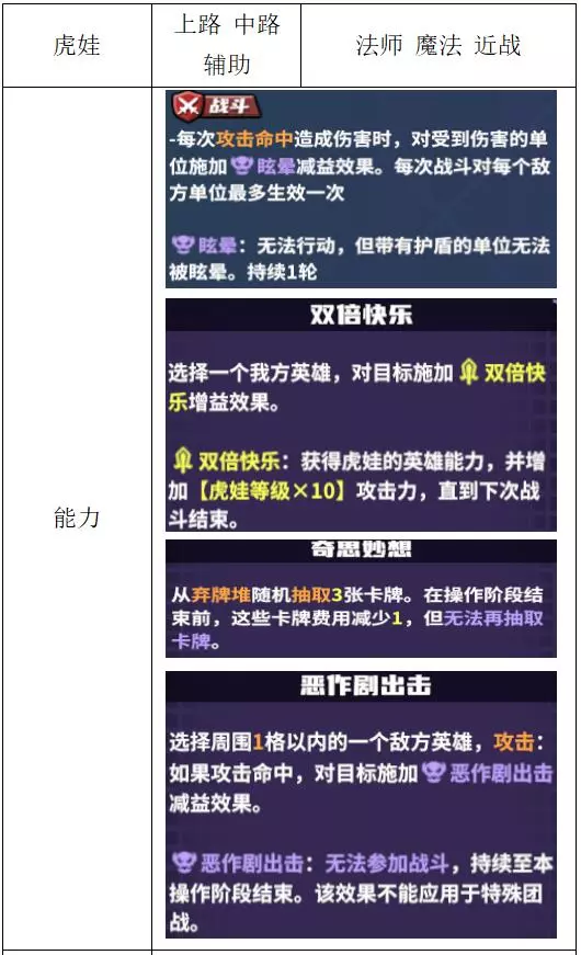关键词:控制、抽卡 评价:良好。攻防兼顾的功能性英雄,常见于辅助位。在对方没有护盾的情况下,团战配合群攻技能可以眩晕大片敌人;作为辅助时,可以通过恶作剧技能进行定点击杀;完全体状态下能够频繁施加眩晕效果。