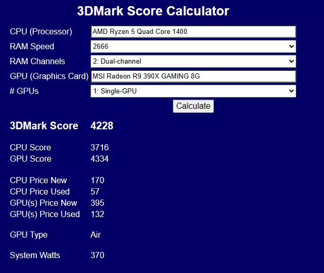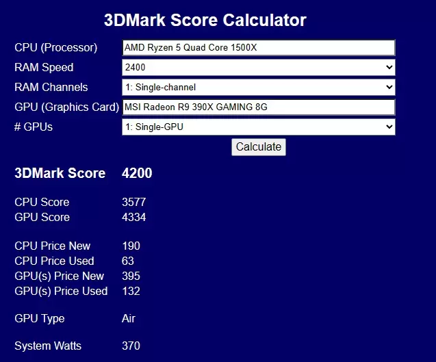 主要配置: CPU:AMD Ryzen 5 四核 1500X 内存:2400 MHz 显卡:微星 Radeon R9 390X GAMING 8G (尝试重新运行3DMark,或者拔出任意部件后重新插入再运行3DMark) 如何自行获得所需数值 我知道你可能需要我列表中的其他数值,并且不知道如何获得完全相同的数值。1. 选择3DMark Score Calculator标签页。 2. 假设你和我一样需要获得刚好4200分,但我只得到了4166分和4228分。 3. 最接近4200分的是4228分。 4. 查看哪些硬件配置能得到4228分: 微星Radeon R9 390X GAMING 8G(4334分) AMD Ryzen 5 四核 1400(3716分) 2条2666MHz内存 5. 在网站上输入这些配置,检查计算器是否有误。