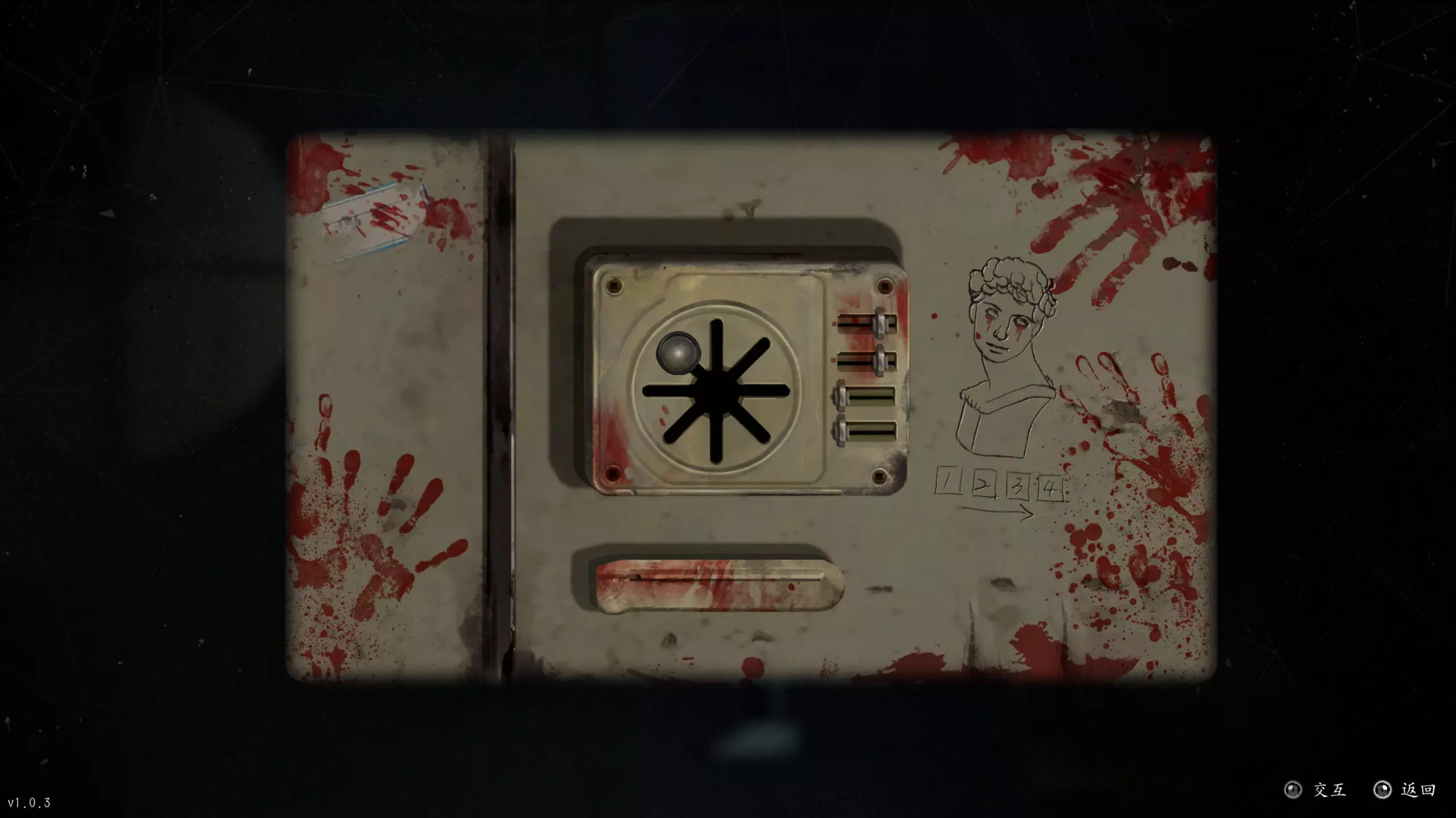 装音乐教室钥匙的密码盒,需查看走廊画像眼睛注视的方位,再结合厕所里的画像得出密码。