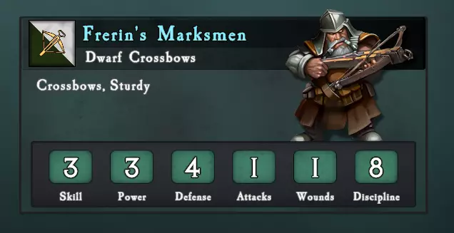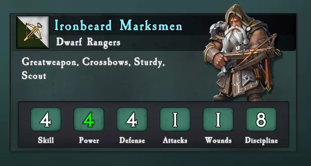 矮人十字弩手:初始技能的不足被其极高的固有防御力以及商店中可获取的防御升级所弥补。矮人特殊符文规则还允许他们的远程单位通过重掷所有攻击(而非仅一次)来集中打击特定目标。该单位与其他单位配合使用时表现出色,但单独作战时并不突出。B级