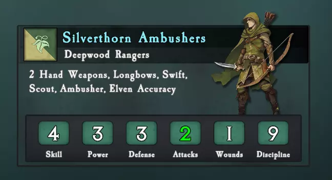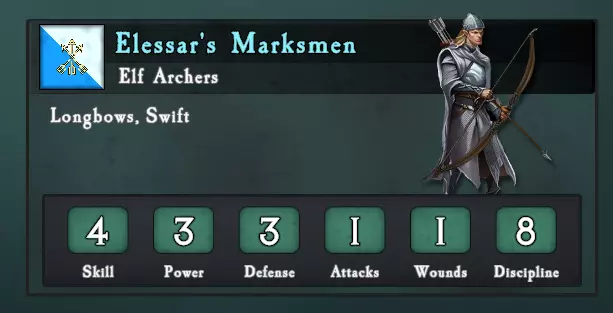 精灵弓箭手:这是一个非常出色的单位,因为它们速度快、技能高,并且拥有一项特殊规则,能让它们的攻击更容易造成伤害(敌人的豁免值减一)。这意味着在战役后期,你实际上拥有了一支超远程的 handgun 单位! A级