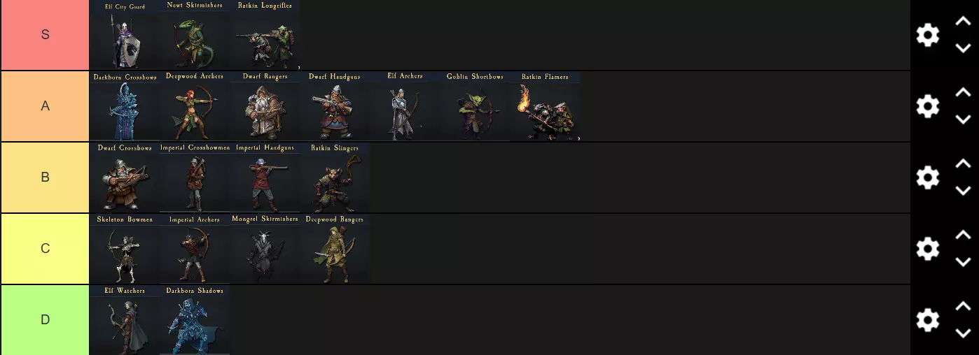 帝国弓箭手:各项属性均衡,但选用长弓作为武器时威力十分强大。帝国远程步兵拥有一项特殊规则,可扩大其远程攻击范围;这意味着你可以将大量弓箭手和火枪手部队部署在后方,在敌军接触到你的阵线前就将其整支部队消灭。不过,他们在技能和防御方面仍有不足,无法在梯队排名中再升一级,但已非常接近。B级 帝国轻骑兵:特别推荐。这些单位非常出色;如果你希望 campaign 轻松一些,可在 campaign 初期招募几支。A级/S级 深渊军团: 该派系在步兵、骑兵和怪物单位上拥有众多出色的近战选择。骑兵和敏捷型怪物对于军队来说至关重要,它们能吸引敌人火力并消灭敌方远程单位及高优先级目标。龙裔和北境骑兵(荣誉提名)具备一定的远程作战能力。 北境骑兵:荣誉提名。是很不错的吸引火力单位,但远程机动性欠佳,评级为C级。因其拥有2次攻击机会,在近战中表现尚可。 B级 龙裔:尽快招募火焰喷射单位,看着鼠人在你的火焰喷射部队焚烧大片敌人并击溃其怪物时哀嚎吧。评级为S级。 亡者国度: 严重依赖重骑兵、散兵和怪物。亡者国度的近战步兵单位表现平平,常被留下来清理溃败的敌人,或作为吸引远程攻击的肉盾。亡灵国度拥有种类繁多的骑兵及类骑兵单位选择,这使其在几乎任何情况下都能提供不错的骑兵选择,但远程作战能力却严重不足。