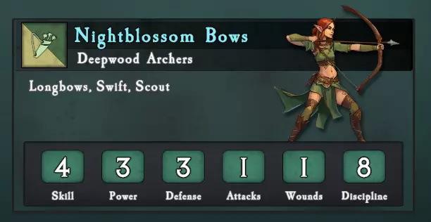 深林弓箭手:因其规模、技能和长弓而成为强大单位。精灵均拥有【迅捷】特殊规则(+1移动点),而该单位还具备【侦察】能力,使其能在战斗开始时部署于掩蔽处,并狙击高优先级目标。这是一个多功能单位,是该派系远程作战的核心。 A级