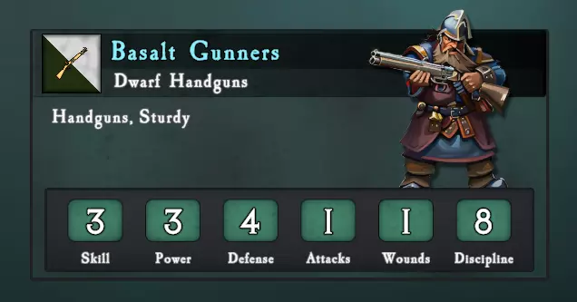 帝国手枪兵:黑火药步兵武器的射程往往比其他远程武器更短,但拥有略高的4点威力值。这使得帝国手枪兵成为更可靠的怪物/骑兵猎手。人类单位的技能值较低(通常初始为3),意味着除非有足够的火力密度,能以枪林弹雨压制敌人,否则他们不太可能发挥显著作用。这是一个拥有尚可特殊规则的不错单位,评级为B级。