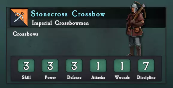 帝国十字弩兵:帝国部队序列中一个介于标准弓箭手和火枪手之间的特殊单位。除武器外,它与其他三个单位没有任何不同的规则,其表现与使用标准弓箭的弓箭手单位一样出色。我希望十字弩兵能进行调整以更具特色,或许可以增加一个以射程为代价提升威力的升级选项。B级