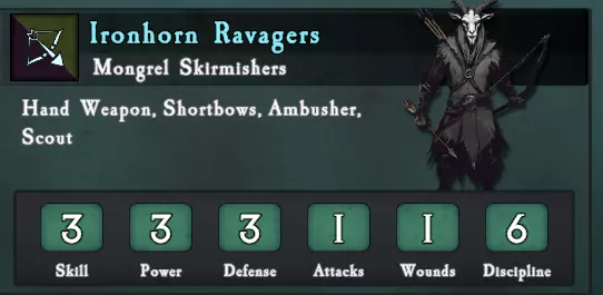 精灵守望者:与其他精灵斥候类单位存在相同问题,在战役后期敌人数量大幅超过我方时,该单位很难发挥作用。由于模型数量少,它们在远程对决中表现也相当糟糕。D级 goatmen raiders:这是一个侧重近战的派系,强调在战场上推进并包抄敌方单位。该派系拥有不错的骑兵和优秀的怪物(牛头怪)。军队中的近战单位必须跟上其他精锐单位的节奏。深渊军团随机+1属性的特殊规则适用于整个军队。