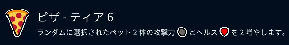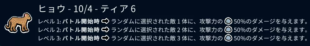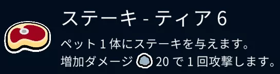食物方面基本吃甜瓜,低属性的宠物则吃牛排。 15回合前后,吃了甜瓜的50/50宠物、老虎、3级豹子以及3级鳄鱼这类宠物会陆续出现。 3级臭鼬也会登场,所以只把战力集中在一只宠物身上是非常危险的。 ・想要的宠物(6阶) 甜瓜(食物) 豹子 牛排(食物) 老虎 蛇 龙 猫 苍蝇 披萨(食物) ・不买的(6阶) 野猪 大猩猩 猛犸象 蘑菇(食物) 【6阶】解说